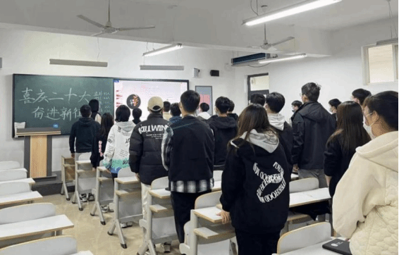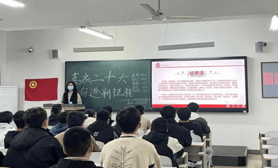伴随着激情高昂的团歌,“喜庆二十大,奋进新征程”主题团课正式拉开帷幕,此次团课由各班团支书主持并主讲,各班团委辅助进行。首先,各班团支书带领学生了解有关“党的二十大报告”的具体内容,阐述了“党在新征程上仍高举中国特色社会主义伟大旗帜、坚定不移走社会主义道路,为全面建设社会主义现代化国家而团结奋斗”的伟大坚守。而后,通过放映学习党的二十大会议相关视频内容,使青年学生更加深刻体会到了百年大党信仰如山、初心如磐的执着与坚定。最后,各班团支书向本班学生讲解此次党的二十大会议主题,倡导青年学生高举中国特色社会主义伟大旗帜,全面贯彻习近平新时代中国特色社会主义思想,自信自强、守正创新,踔厉奋发、勇毅前行。
