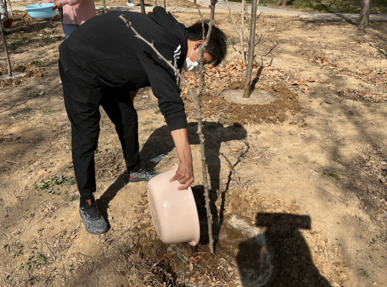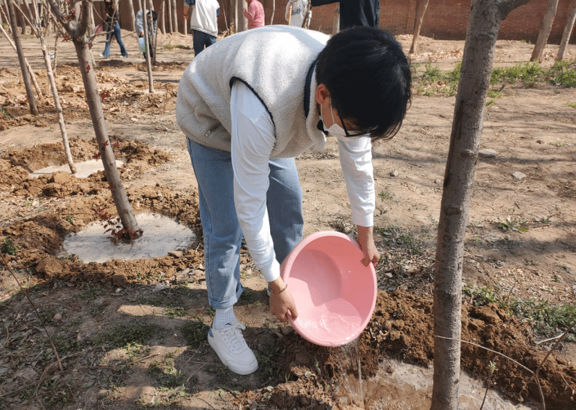 活动伊始,尹院长拿起铁锹走向浇灌区,挥锹铲土、提水浇灌,连续浇灌多棵树苗,学生党员们也认真学习,相互合作一起培土浇水、亲切交流。在这过程中学生们深深体会到照顾树苗的不易和亲自浇灌的快乐,浇灌结束后,尹院长依次介绍了每棵树的名称以及栽种的初始时间,整个活动井然有序,热闹的场面温馨而快乐。