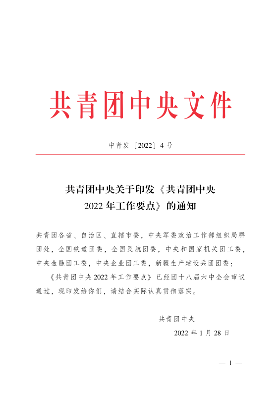 共青团中央关于印发 《共青团中央 2022 年工作要点》 的通知