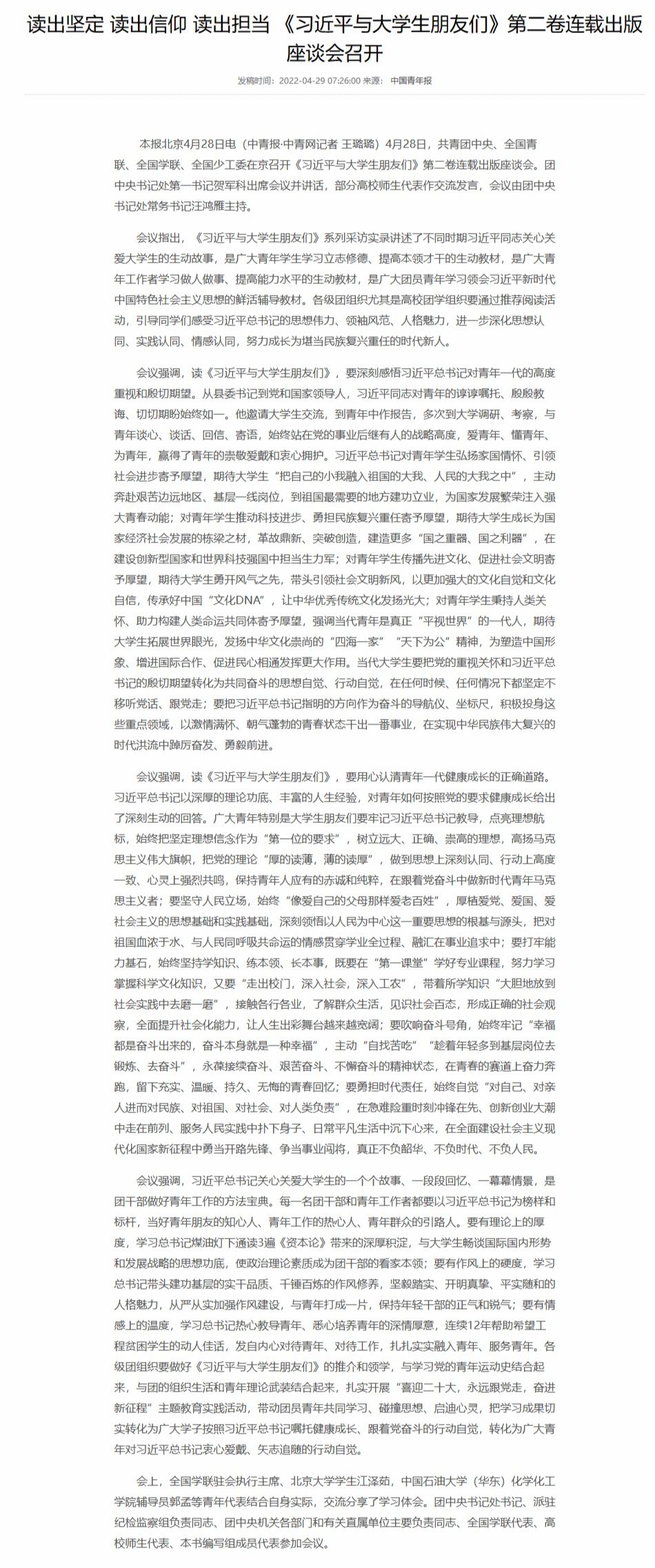 共青团中央、全国青联、全国学联、全国少工委在京召开《习近平与大学生朋友们》第二卷连载出版座谈会。团中央书记处第一书记贺军科出席会议并讲话,部分高校师生代表作交流发言。