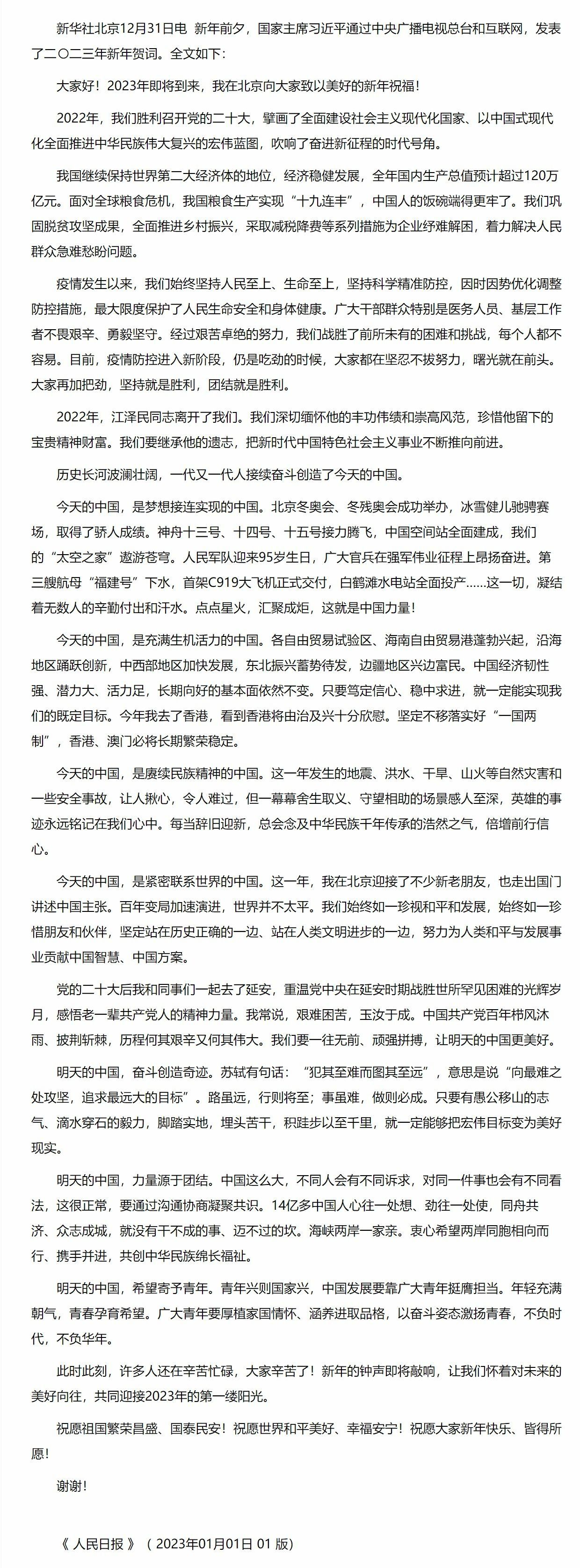 新华社北京12月31日电 新年前夕,国家主席习近平通过中央广播电视总台和互联网,发表了二〇二三年新年贺词。