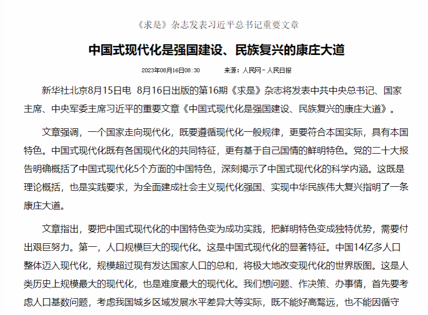 :8月16日出版的第16期《求是》杂志将发表中共中央总书记、国家主席、中央军委主席习近平的重要文章《中国式现代化是强国建设、民族复兴的康庄大道》