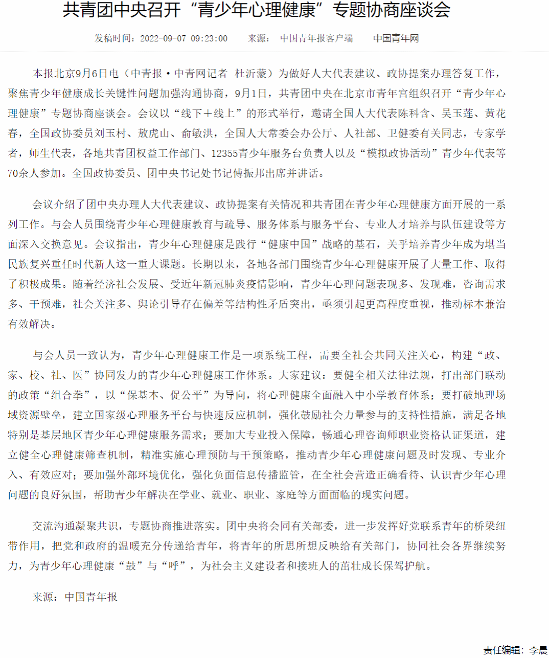 为做好人大代表建议、政协提案办理答复工作,聚焦青少年健康成长关键性问题加强沟通协商,9月1日,共青团中央在北京市青年宫组织召开“青少年心理健康”专题协商座谈会。