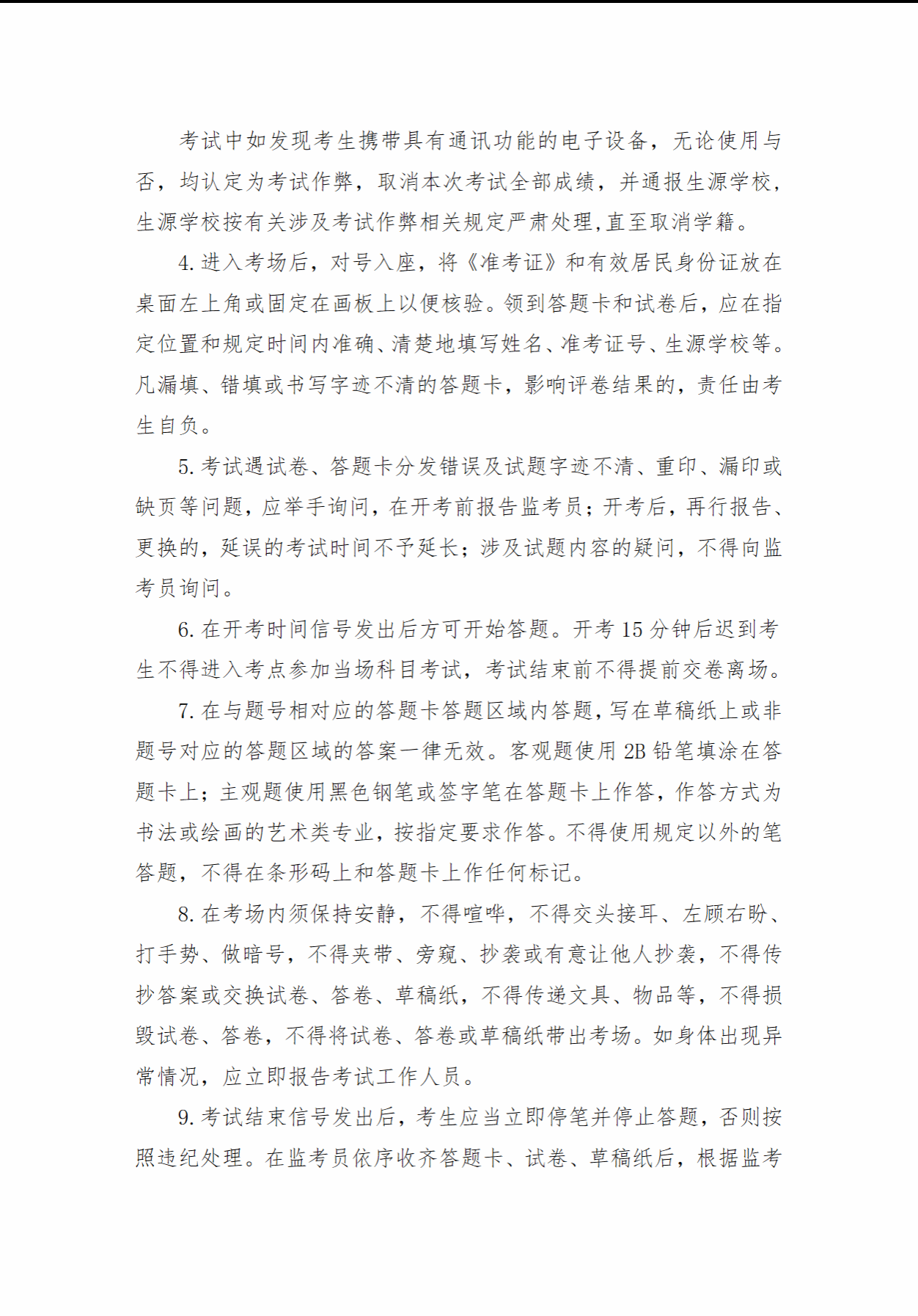 1.充分知晓手机作弊严重后果。考生在考试中随身携带手机等具有发送或者接收信息功能的设备,无论使用与否,均认定为考试作弊,取消全部成绩,并通报生源学校,生源学校按有关涉及考试作弊相关规定严肃处理,直至取消学籍。