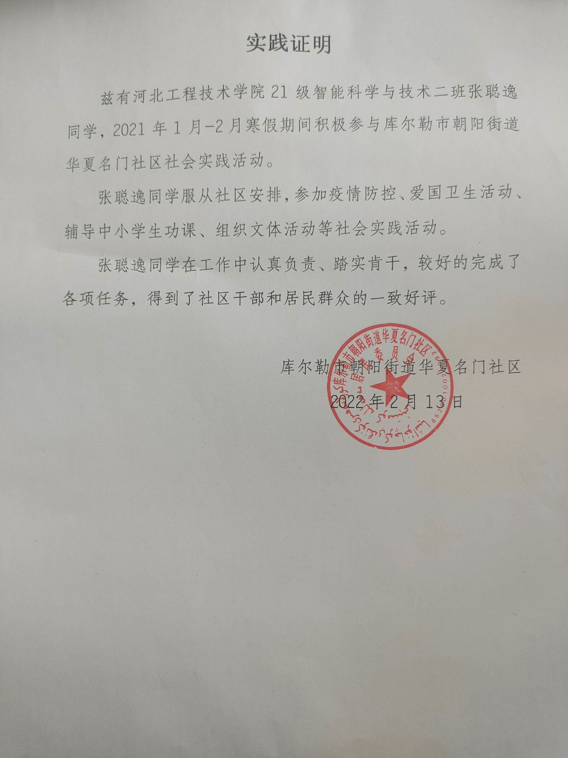 习近平总书记在给北京大学援鄂医疗队全体“90后”党员的回信中提到“青年一代有理想、有本领、有担当,国家就有前途,民族就有希望,让青春在党和人民最需要的地方绽放绚丽之花”。张聪逸同学作为一名大学生党员,深入学习贯彻习近平总书记对广大青年的五四寄语精神,尽自己的力量为家乡做贡献,于是在2022年寒假到来之际,参加了由新疆库尔勒市朝阳街道华夏名门社区组织的系列社会实践活动。
