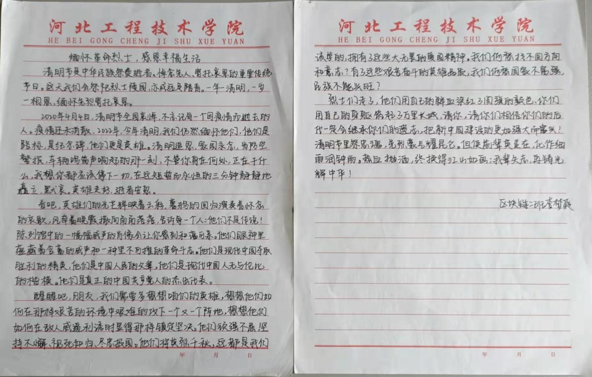 时至清明,我们回顾中华民族的风雨历程,八年的浴血奋战,革命英雄抛头颅洒热血,最终取得革命伟大胜利。许多同学感叹,我们的民族是多么的强大,我的祖国是多么的伟大,在党的带领下,中国,真正成为了东方的一条龙。我们要把缅怀革命先烈的情感化作建设社会主义和谐社会的巨大动力,努力学习,为国家的富强贡献自己的力量。