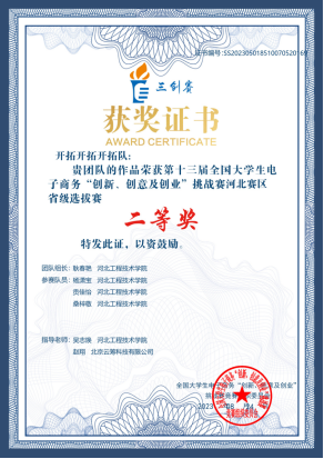 三创赛的参赛流程为:现场报道-抽签,拷贝PPT-现场赛分组赛-汇总成绩公布决赛名单-领导致辞-现场终极赛-闭幕式,颁奖。经过一番激烈的竞争,“开拓开拓开拓队”荣获省级二等奖的佳绩。