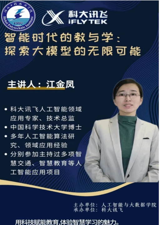 本次讲座将邀请科大讯飞企业中最具权威的专家江金凤博士,与学生们就大模型的发展历程、应用场景和未来趋势等方面进行深入探讨。同时,还将邀请多位业界专家分享他们在大模型应用方面的实践经验和创新思路,为广大师生提供一场思想盛宴和学术交流的平台。本次讲座的主题是“智能时代的教与学:探索大模型的无限可能”,旨在探讨大模型在智能时代的应用和未来发展,为广大师生提供前沿的学术研究和实践经验,促进人工智能与教育教学的深度融合。