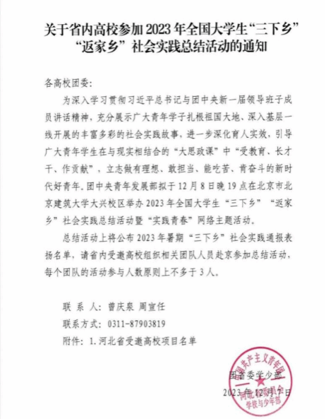2023年12月8日aa3044永利集团“听党话,跟党走”实践团队受共青团中央邀请赴京参加2023年全国大学生“三下乡”“返家乡”社会实践总结暨“实践青春”主题分享活动。