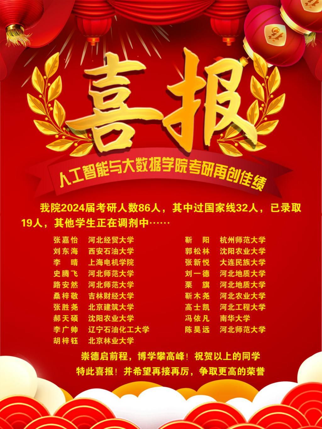 近日,全国各高校陆续发布2024年全国硕士研究生拟录取名单,永利官网学子捷报频传,录取人数再创佳绩。截至目前,永利官网2024届考研人数86人,其中过国家线32人,已录取19人,其他学生正在调剂中……