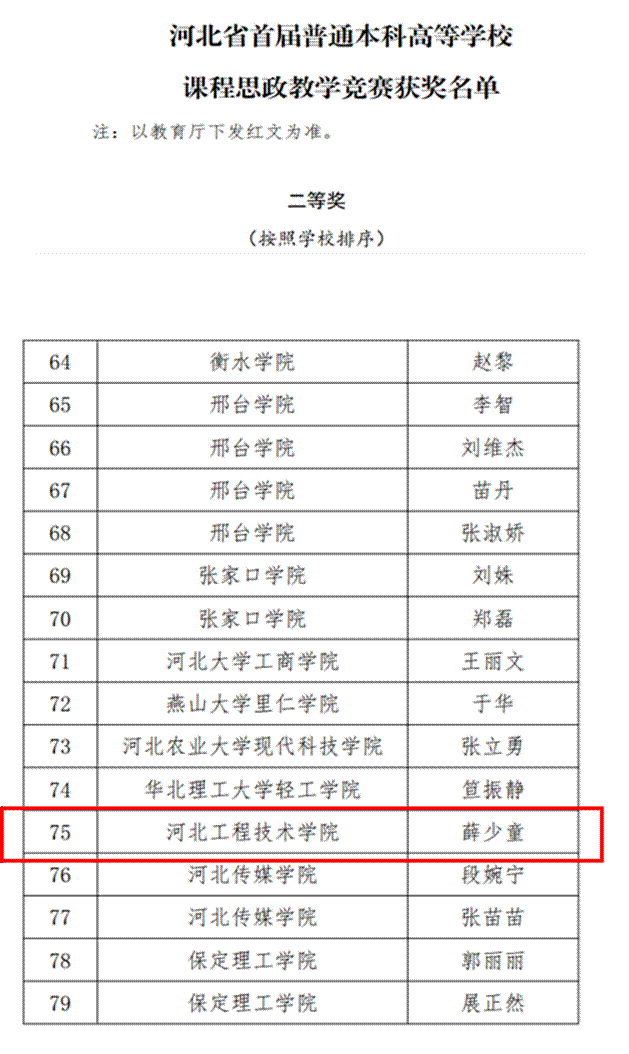 近日,河北省首届本科高校课程思政教学竞赛圆满落幕。竞赛自3月17日启动,为期两天,永利官网薛少童老师历经校赛、省赛半决赛、省赛决赛等环节,最终获得二等奖。