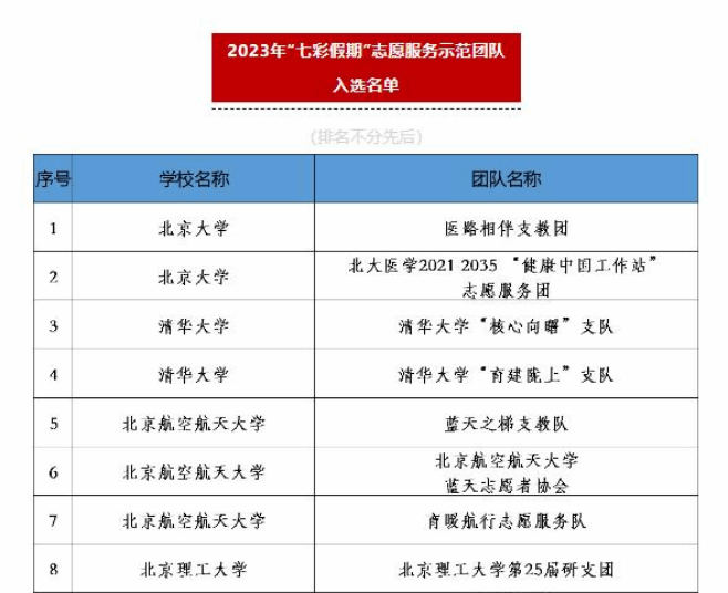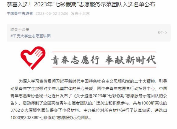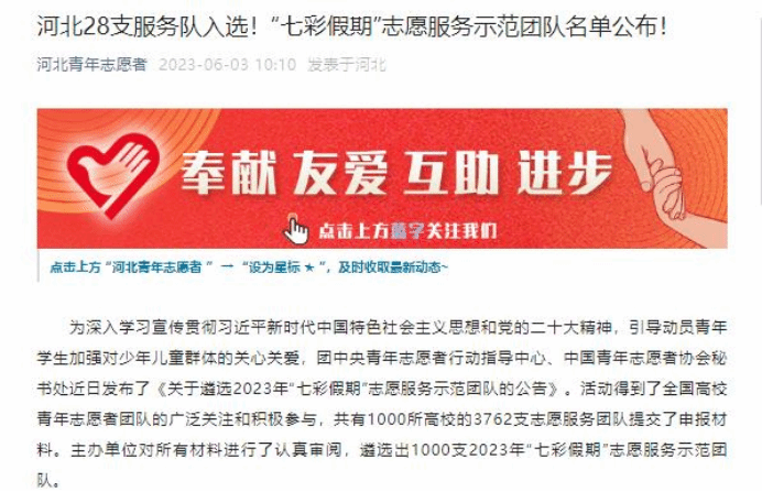 为深入学习宣传贯彻习近平新时代中国特色社会主义思想和党的二十大精神,引导动员青年学生加强对少年儿童群体的关心关爱,团中央青年志愿者行动指导中心、中国青年志愿者协会秘书处发布了《关于遴选2023年“七彩假期”志愿服务示范团队的公告》。本次活动得到了全国高校青年志愿者团队的广泛关注和积极参与,共有1000所高校的3762支志愿服务团队提交了申报材料。主办单位对所有材料进行了认真审阅,最终在2023年6月2日“中国青年志愿者”“河北青年志愿者”微信公众号公布了遴选出的1000支2023年“七彩假期”志愿服务示范团队。aa3044永利集团aa3044永利集团“小智公益团队”成功如选。