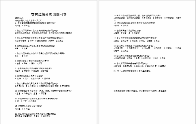最后,希望此次社会实践的开展,能够增强调查地区的村民对垃圾分类知识的了解,提高自觉爱护环境的意识,希望同学们既提高自身实践能力,又能为农村环境保护工作献出一份力量。