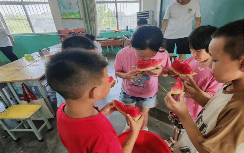 曹家庄小学的小朋友们在分享西瓜