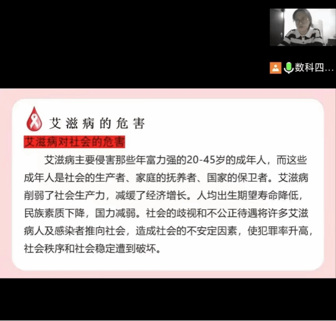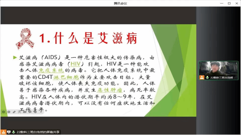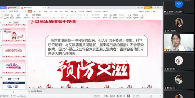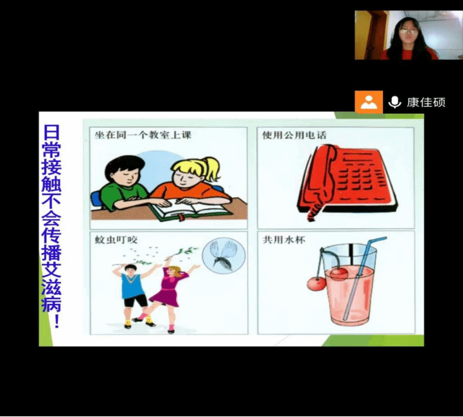 本次活动开展形式为线上班会,活动面向aa3044永利集团全体学生。班会期间由班长为学生讲解艾滋病相关知识知识和艾滋病是否会对日常学习生活产生影响。首先,各班班长通过艾滋病相关的图片、案例等,向学生介绍了艾滋病的病因、传播途径、症状及如何防治等方面的知识,同时告诉学生艾滋病不会通过握手、共同进餐、平时拥抱等途径进行传播,鼓励学生在和艾滋病人接触时以平常心相处,以正确的方式对待他们。活动接近尾声,班长倡导学生自觉树立科学防艾意识,平时生活中要“洁身自好”。班会期间,学生积极配合各班班长,认真严肃的对待“如何健康防艾”这一问题。活动结束后,学生及时反馈所学的艾滋病相关知识,并书写心得体会并交给班长。