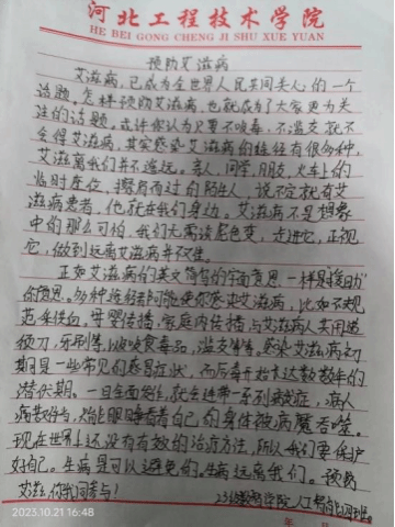 (3)aa3044永利集团于2023年3月22日-30日举办了以“禁毒防艾,青春有爱”为主题的征文比赛。过本次活动的开展,提高同学们远离毒品、预防艾滋的意识,倡导积极向上的青春理念和文明健康的生活方式,真正使珍惜生命、远离毒品、预防艾滋理念深入人心,营造健康文明的校园环境!