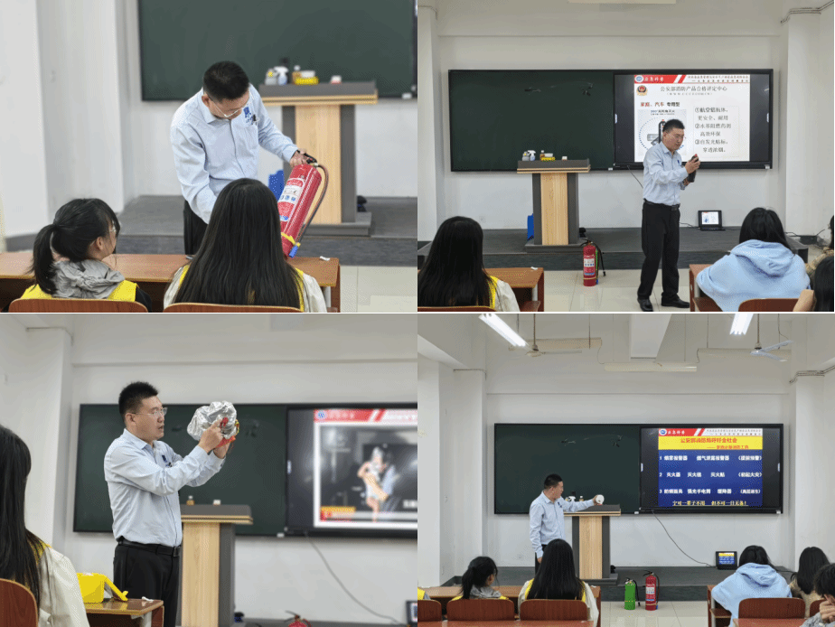讲座中,张磊教官分享了近期关于重大火灾事故的最新信息,以此提醒学生们注意身边时刻存在的火灾隐患。紧接着,张教官又向学生们展示了火灾应急计划、火灾发生时的逃生技巧、如何使用灭火器、如何使用防烟防毒面具和如何识别火灾风险。过程中张教官表示:“火灾是一个常见但可以避免的灾难,我们希望通过这次讲座帮助学生们了解如何减少火灾风险,以及在紧急情况下如何保护自己和他人。鼓励每位学生认真学习预防火灾发生的可能性,一起学习如何保卫生命和财产。”