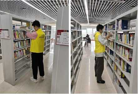 志愿者们认真整理书架上的图书,将其进行分类和编号,确保图书馆的藏书有序并易于查找。