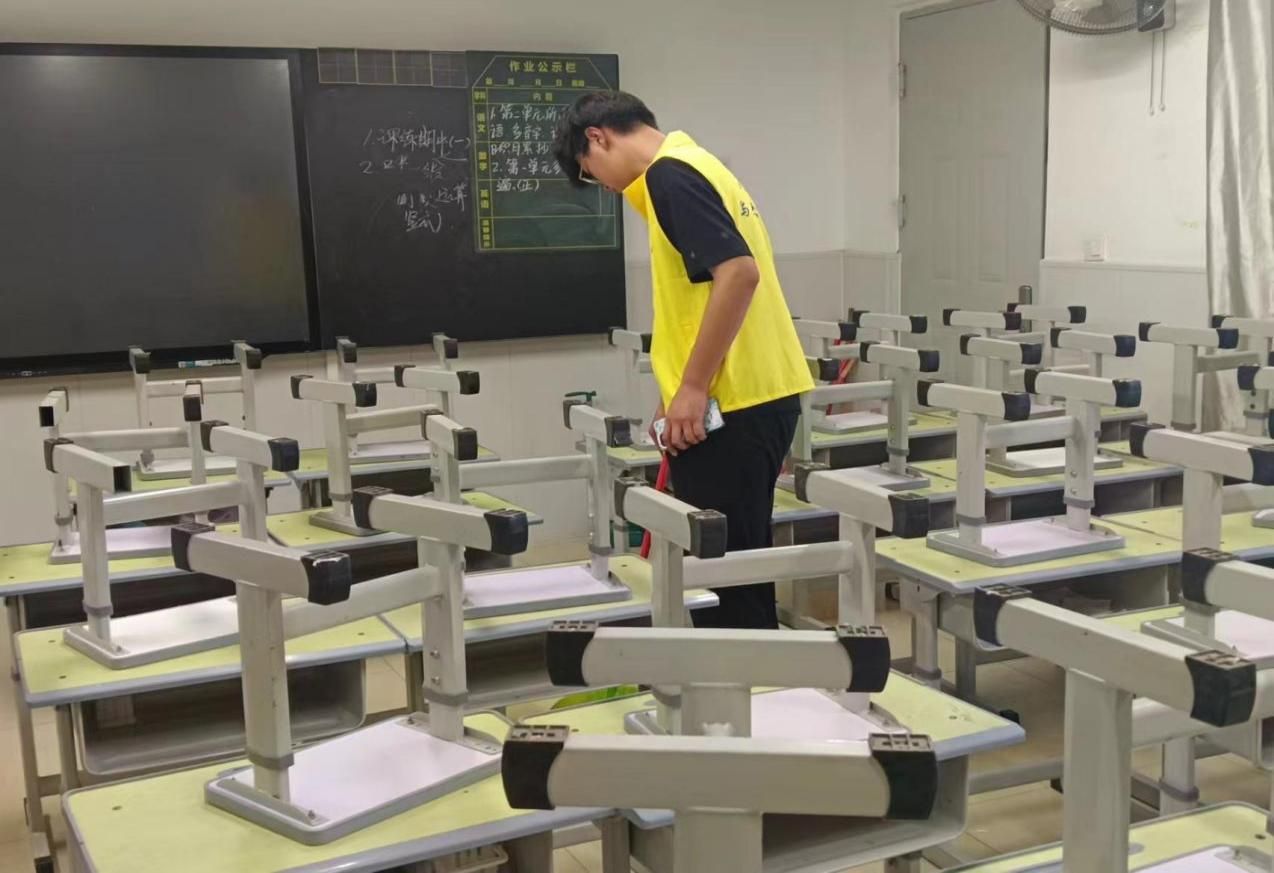 当放学铃声敲响,学生们陆陆续续离开教室,辛勤的志愿者们还自愿留下帮助学生们打扫教室,清理垃圾杂物,将桌椅摆放整齐,为小学生们营造一个干净整洁的学习环境。焕然一新的教室能够让学生们更加专注和集中注意力。