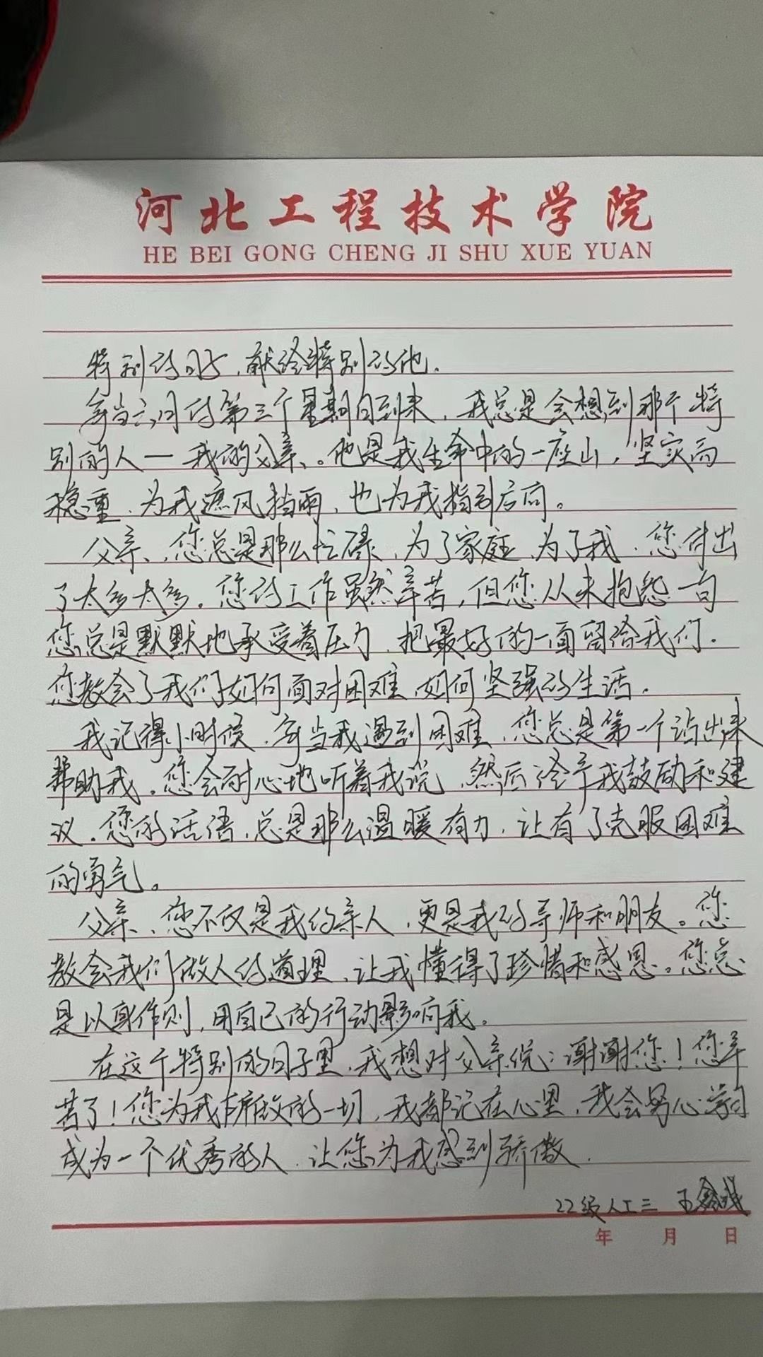 此次活动旨在通过收集和分享学生们与父亲之间的真实故事,展现父爱的深沉与温暖,传递家庭幸福的正能量。活动一经启动,便得到了学院学生的热烈响应。大家踊跃参与,纷纷将自己与父亲的珍贵记忆和感人故事上传至活动平台。这些故事中,有的讲述了父亲在自己成长道路上的默默付出,还有的回忆了与父亲共同度过的美好时光。每一个故事都充满了情感的温度,让每一位读者都能深刻感受到父爱的力量。