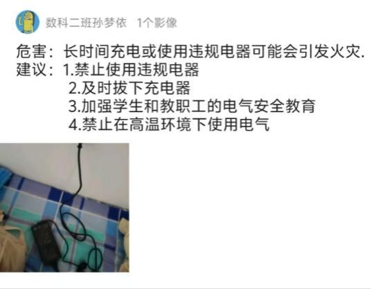 在本次活动中,学生们积极参与,化身“安全侦探”,深入校园各个角落,捕捉那些可能存在的安全隐患。这些隐患包括电线老化、消防通道堵塞、违规使用电器等等。每一张照片都配有详细的文字说明,不仅展示了隐患本身,还提出了切实可行的整改建议,体现了学生们对校园安全的深刻认识和高度责任感。为了确保活动的顺利进行,工作人员创建了一个专门供参与人员们沟通交流的QQ群,学生们在群内分享自己的摄影作品,共同探讨如何更好地提升校园安全水平。