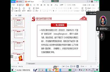 本次会议主要为大家讲解征兵入伍的一些政策和福利,秦冰松同学是2018年高中毕业参军入伍两年然后退伍回到学校,以自己的亲身经历给大家做分享。首先秦冰松为大家讲解了参军入伍的基本条件,包括身体条件、年龄要求和政治要求,要符合所有的条件才能当兵入伍,然后就是介绍了报名参军的基本流程,如网上报名,初检初审,体检政审等流程。帮助同学们更进一步的了解了参军的一些事项,然后进一步了解了入伍保留学籍的政策、学费补贴、考军校提干等一系列优惠政策。还有大家比较关注的退役之后的安置问题。通过本次的讲解帮助同学们解开了很多不惑,使同学们对参军入伍的政策有了更深的了解,鼓励同学们积极认真对待应征入伍。
