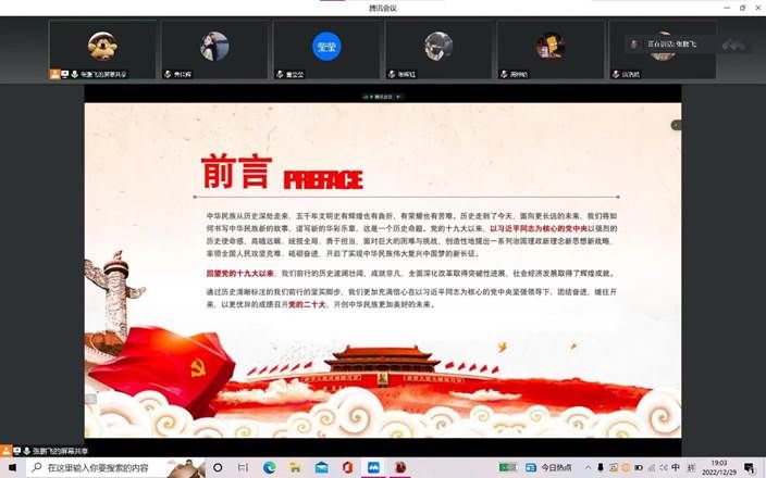 本次宣讲中,张鹏飞老师首先介绍了党的二十大的会议主题,同时带领学生们全面了解了党的二十大召开进程、党的二十大会议议程、党的二十大报告内容。然后张鹏飞老师通过介绍两个“极不”,三件大事和六个坚持,简单地讲述了过去五年的工作和新时代十年的伟大变革。习近平总书记和中国共产党人初心不改、始终如一。新时代的伟大成就是党和人民奋斗出来的,青年是祖国的未来和希望,广大青年应该肩负历史使命,在新时代谱写新篇章。