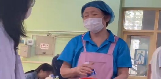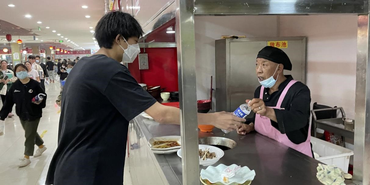 志愿者为餐厅的劳动者送水