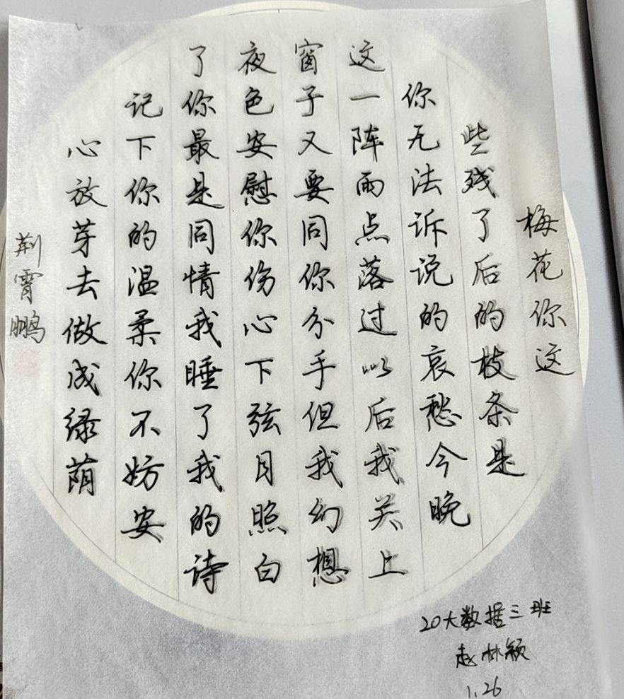 行楷隶篆见功夫,墨香满园耀夜空。为丰富同学们的假期文化生活,培养良好的书写习惯,传承汉字书写,弘扬民族之魂,aa3044永利集团aa3044永利集团于2022年1月5日至2022年1月30日在线上开展“以笔传情,书写佳节”主题书法作品活动。