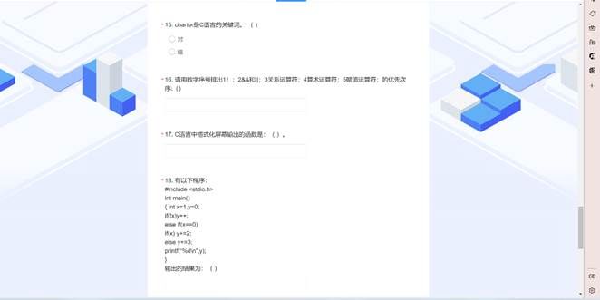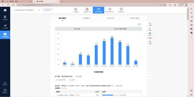 本次活动共计134名优秀的学生代表参加,采取线上答题的方式,参赛学生在规定时间内参加比赛,并用所学知识在限定时间内根据题目完成准确编程,完成编程后便可以交卷离场。最后工作人员会根据学生们对基础知识的掌握程度和所编写程序运行结果的正确率评选出一二三等奖和参与奖。此次出题难度适中,个别具有挑战性,学生们总体上都获取了十分优异的成绩,这离不开平日里对学习的认真态度,我们也不难看得出学生们对C语言浓厚的学习兴趣。