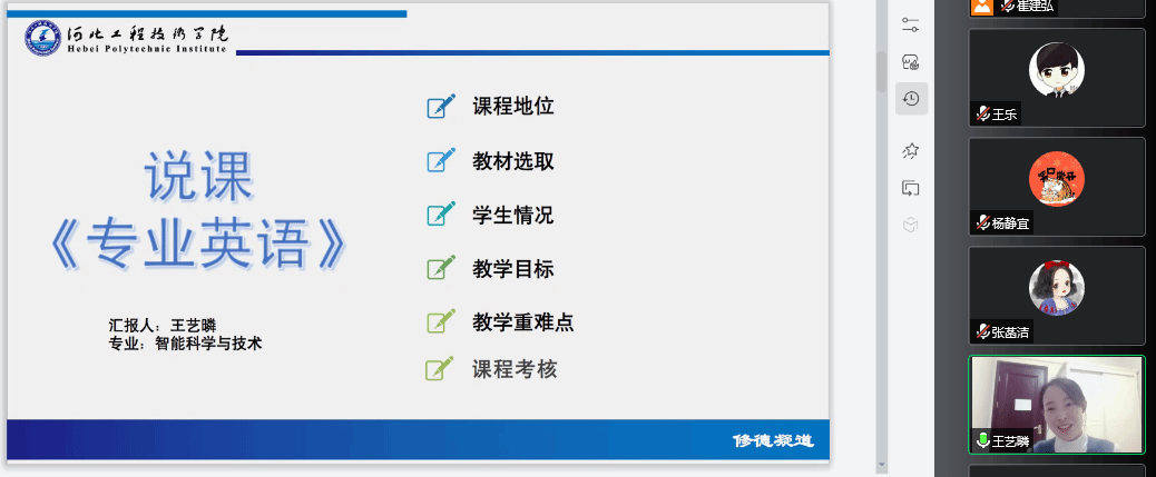 我系王艺暽老师的参赛的课程是《专业英语》,王老师对教学重难点的把控精准,课程考核分析到位,层次清楚,尤其教姿仪态非常标准,这是我们值得学习借鉴的。