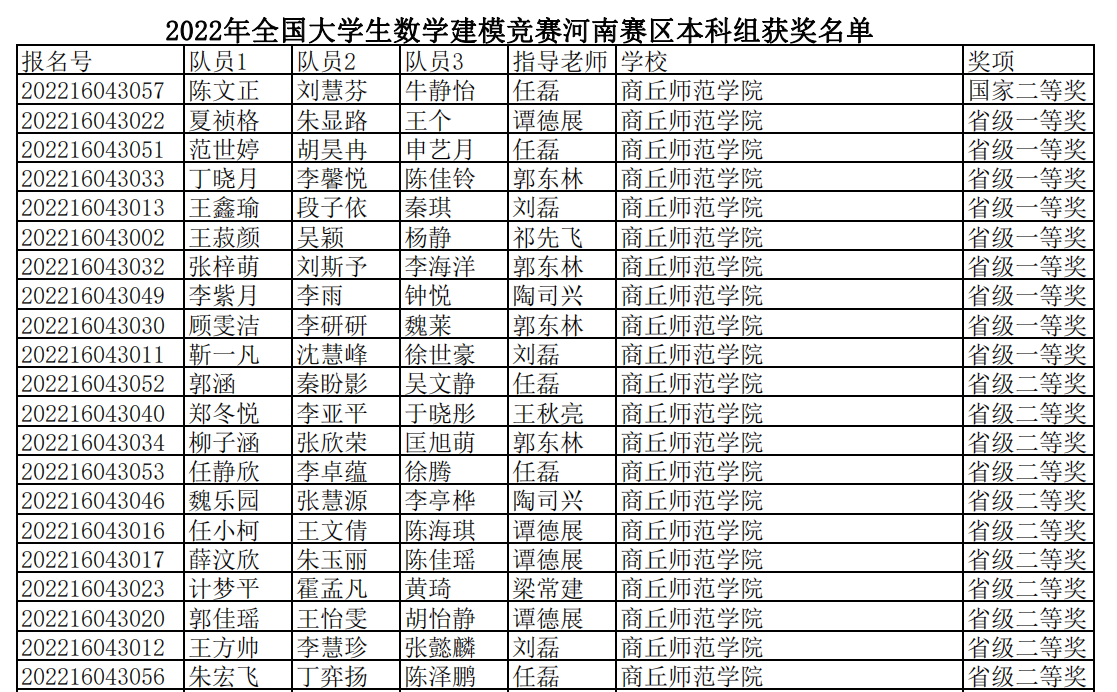 近日,2022年全国大学生数学建模竞赛(CUMCM)成绩揭晓,商丘师范学院获全国二等奖1项、河南省一等奖9项、河南省二等奖11项,河南省三等奖14项。本届大赛有来自全国及英国、马来西亚等国家的1606所院校/校区、54257队(本科组49424队、专科组4833队)、超过16万人报名参赛。