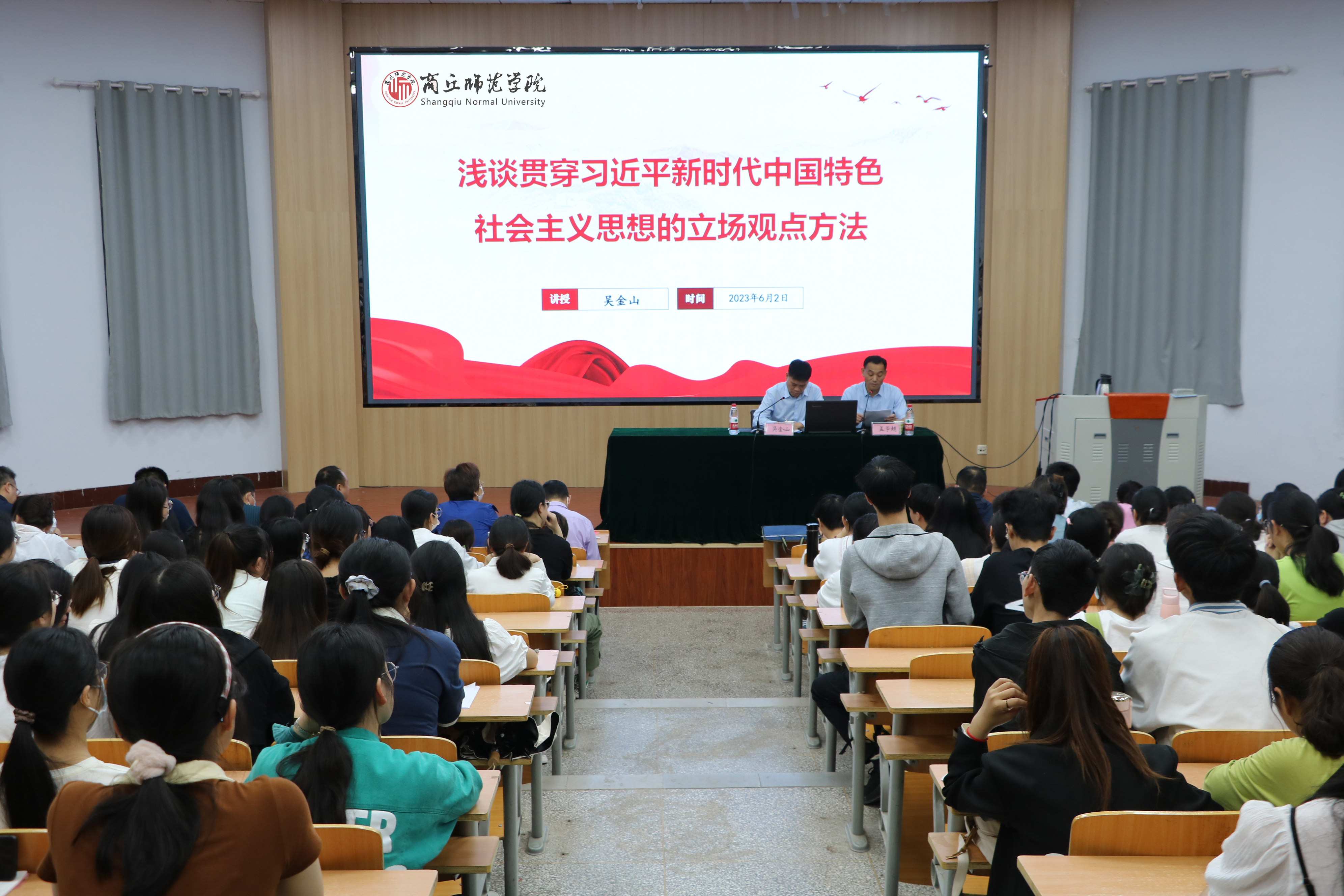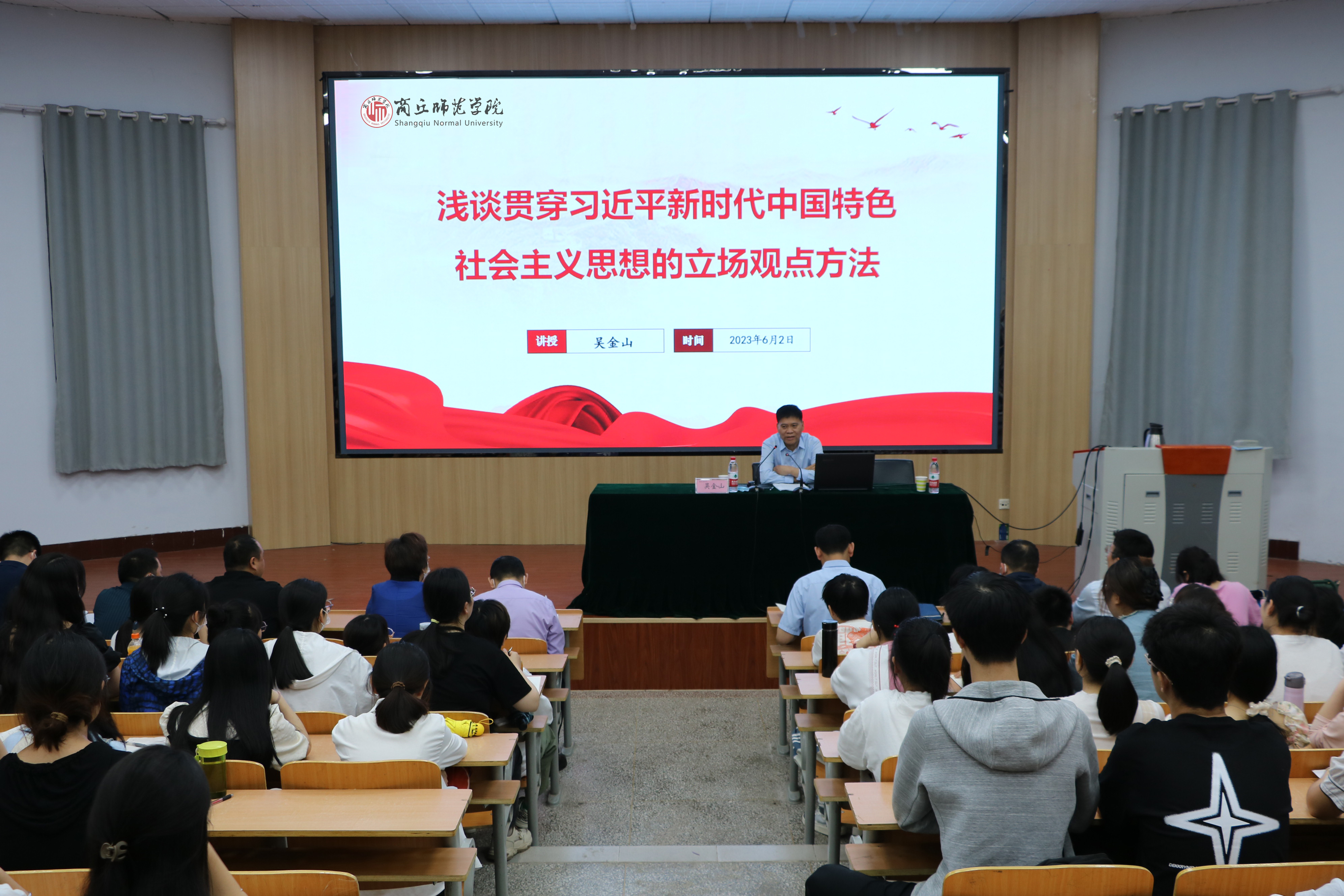 根据中央和省委有关文件要求和校党委的安排,6月2日上午,校党委副书记吴金山深入beat365英国官网网站,以《贯穿习近平新时代中国特色社会主义思想的立场观点方法》为题,为学生上了一堂思想政治课。beat365英国官网网站领导班子成员和非毕业年级部分学生、教师160余人参加。