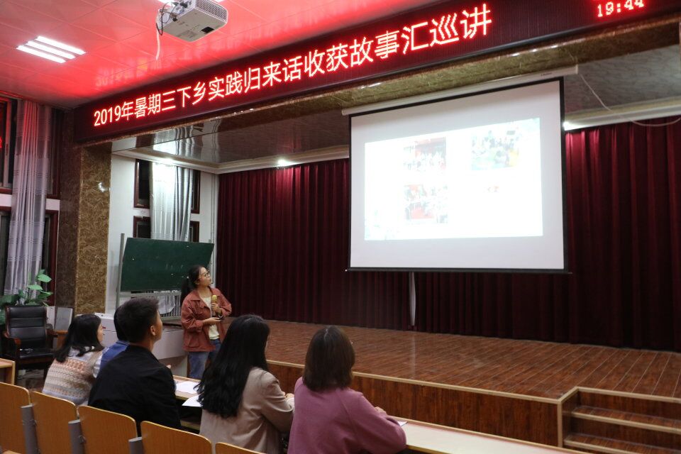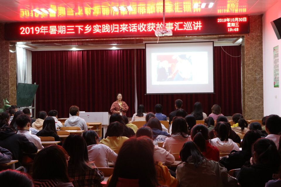 为进一步宣传展示实践成果,深入了解社会实践活动,由商丘师范学院校团委主办的"2019年暑期三下乡实践归来话收获故事汇巡讲" 活动于10月30日晚在睢阳区生物报告厅圆满举行。本次故事汇巡讲活动共有19个团队参加。