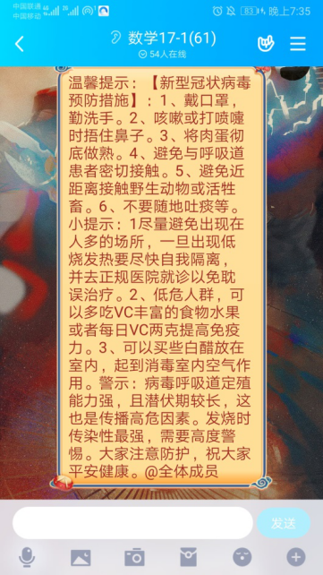 作为班长,主动询问班级内每位同学在家的安全情况,叮嘱同学们注意卫生安全,询问同学们每天体温、身体健康等状况,切实做到保障每位同学的人身安全。