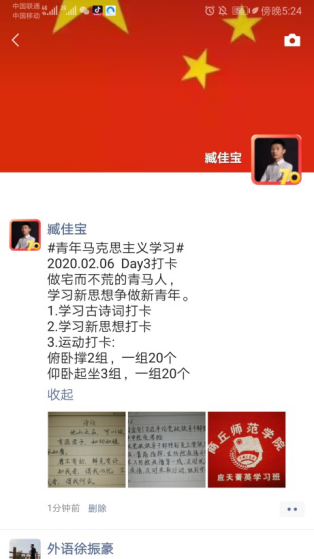 同时,臧佳宝作为青年马克思主义学习者,在不出门的情况下,做一个宅而不荒的青马人。他每天学习新知识,观看并学习党的和教育知识理论,对重点内容进行笔记,并在学习之余写下学习心得体会。