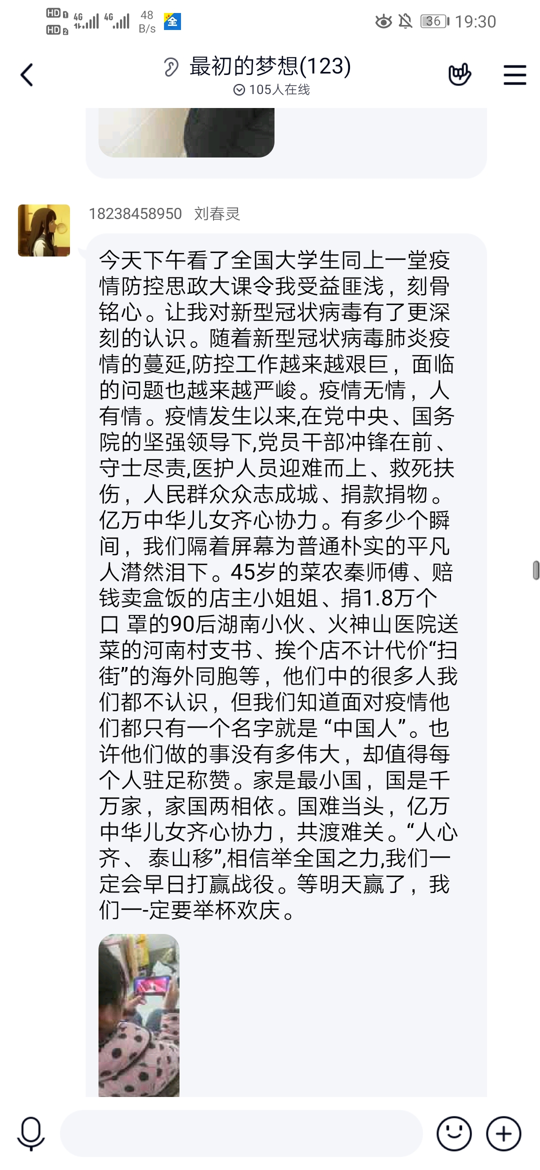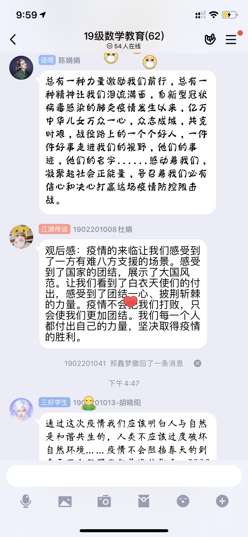 18级专升本毕业班党员杨杰说道:“虽然新型冠状病毒肺炎来势汹汹,给我们的生活蒙上了厚厚的阴影。但是作为学生作为社会主义接班人的我们要把疫情当作学习的机会,去学习前辈们这种处惊不变,舍己为人的精神,我们要利用好这个机会,静下心来想一想自己的人生规划,树立正确的人生观、价值观,把我们的祖国建设得更加繁荣富强。