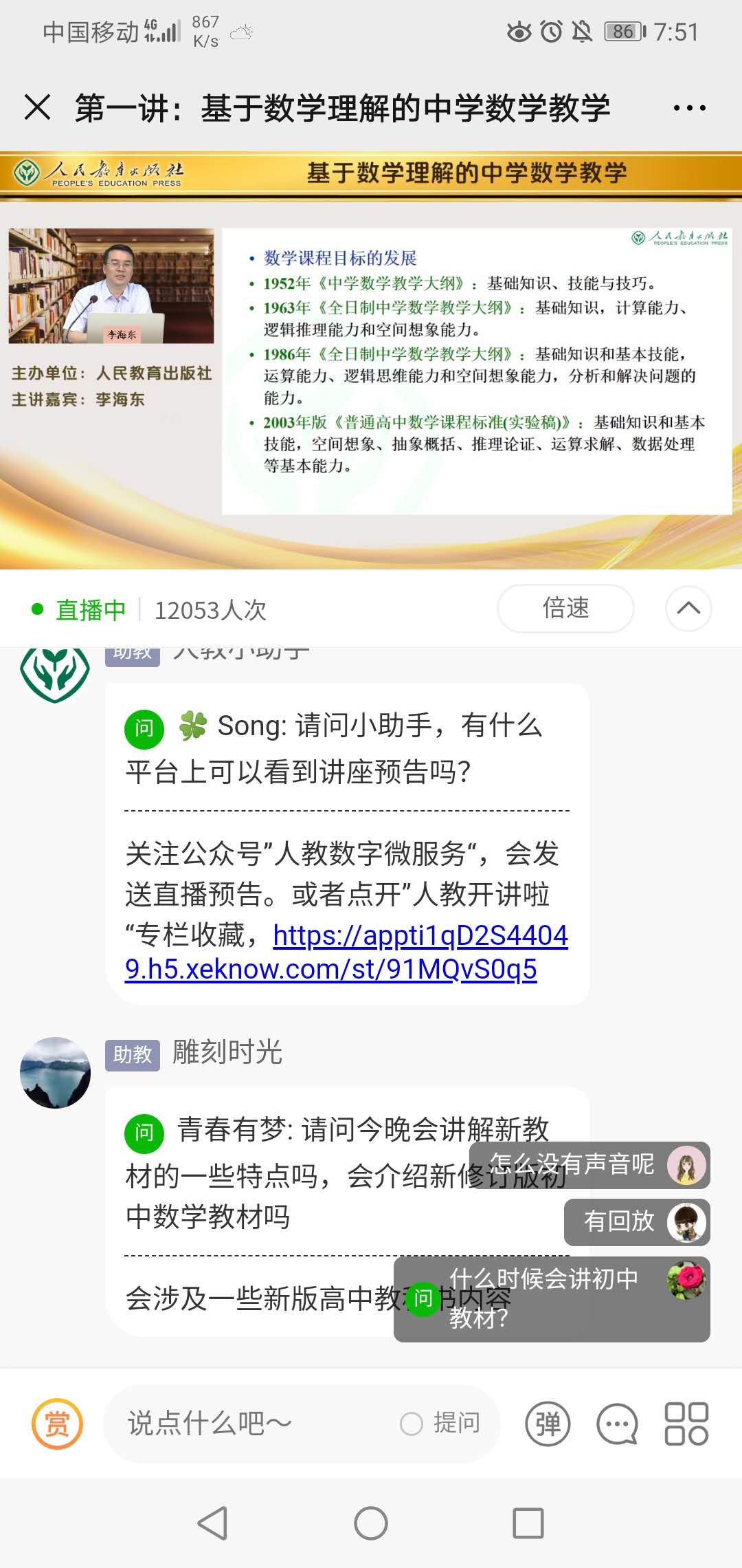 本次活动的主题是“数学理解的中学数学教学”,7:30直播准时开始。基于我国基础教育课程改革正在进一步深入,核心素养是改革的核心问题,李老师围绕“数学核心素养是什么”、“如何理解数学核心素养”、“怎样落实核心素养”三个问题进行深入讲解,把教师本身和教学实践紧密联系在一起。最后,李老师既给师范生讲解了数学教育的重要地位,又结合自身实际阐述了身为数学教师在教学实践中应注意的问题。观看直播的师范生,不但就李老师提出的问题在讨论区发表自己的看法和见解,还积极地提出问题并进行热烈讨论。直播结束后,观看直播的师范生对直播内容认真地总结并和没有观看直播的同学进行分享。