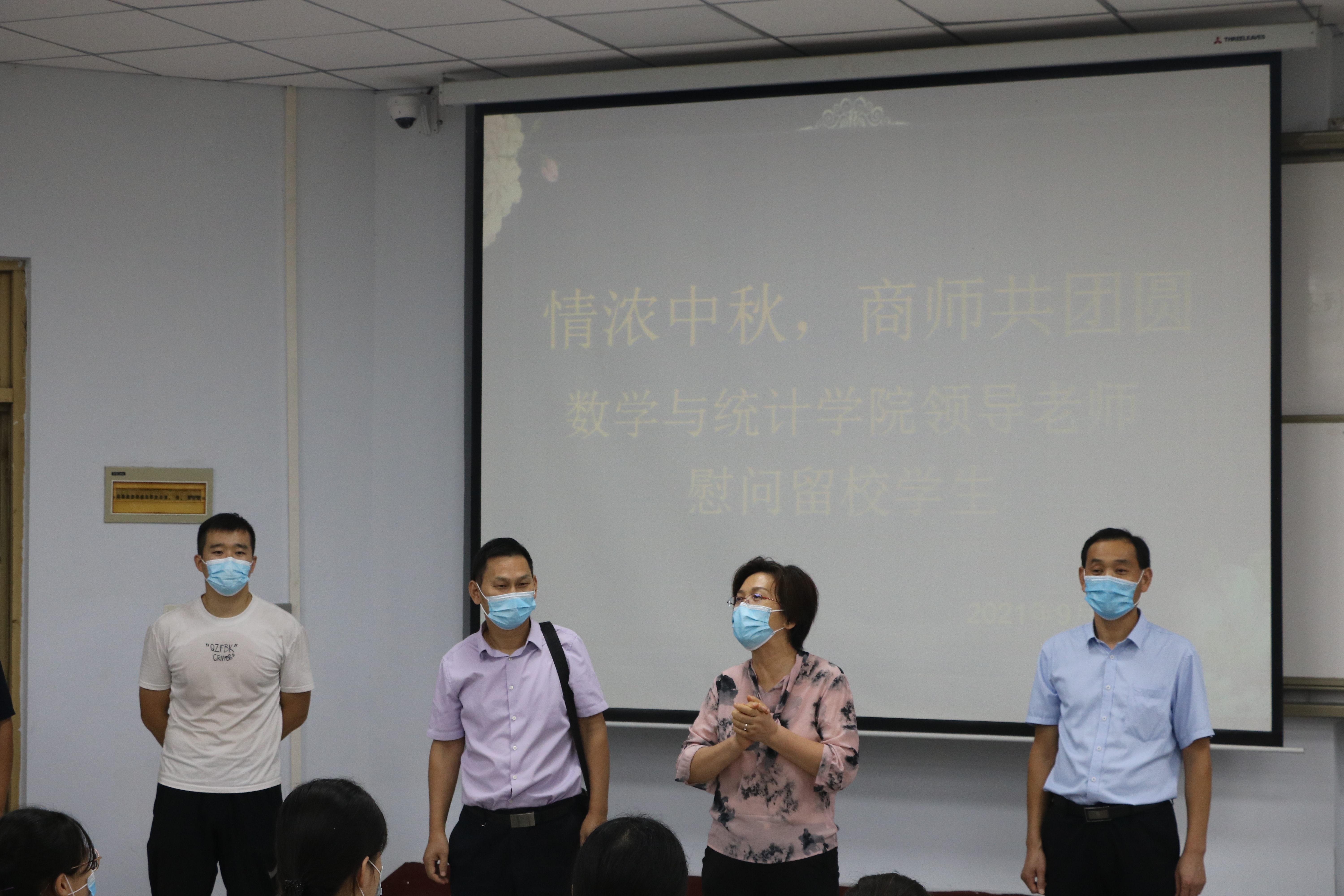 在中秋国庆双节来临之际,为营造祥和愉悦的节日氛围,让留校学生在学校欢度佳节、感受家的温暖。2021年9月18日下午6点,beat365英国官网网站党委书记孟学超,院长张斐然,党委副书记陈树艳,副院长刘磊,团总支书记姜素华及18级辅导员李昊阳前往教学楼108教室为留校学生送去月饼和节日祝福。