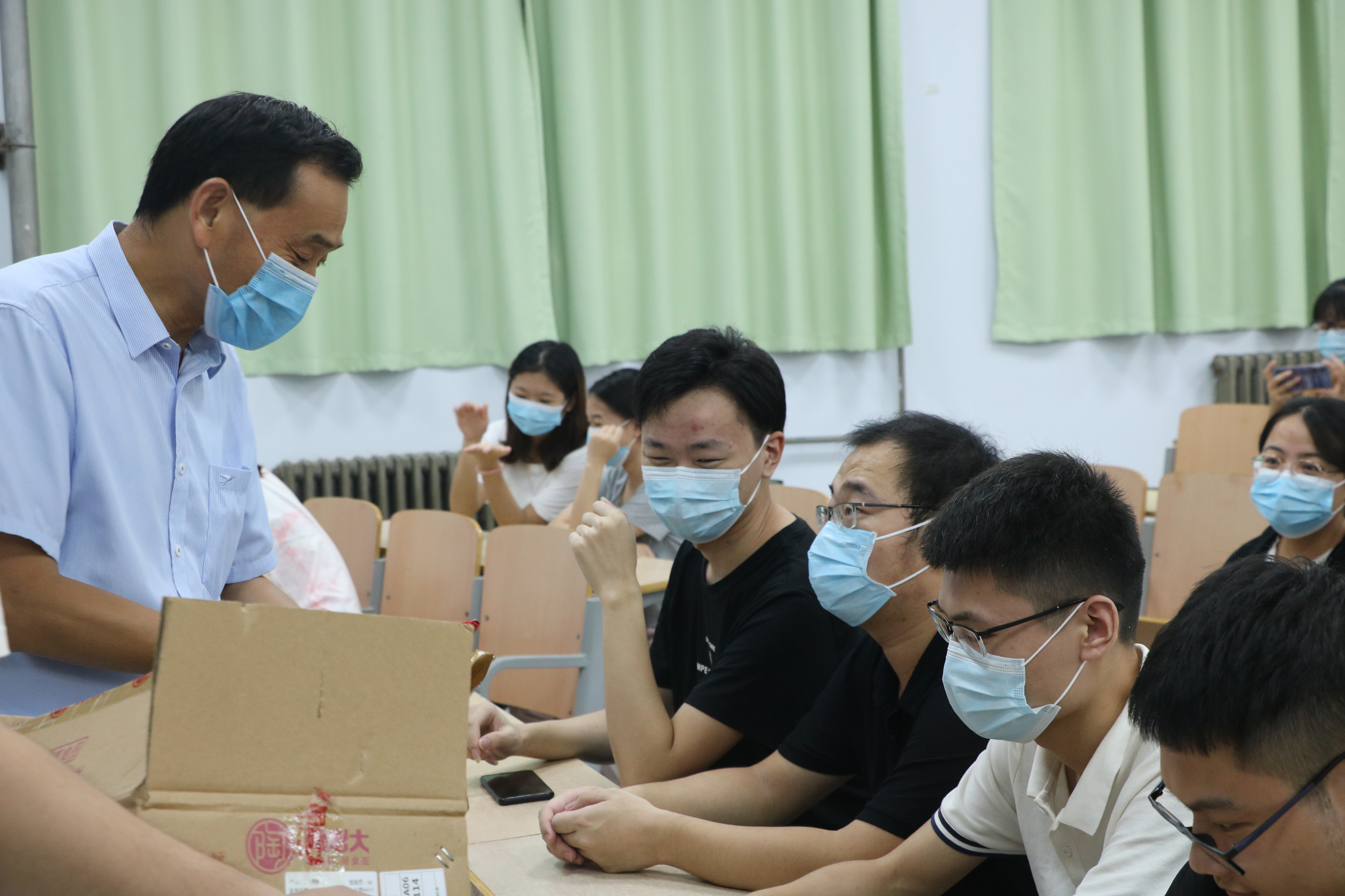 活动伊始,陈树艳亲切慰问留校同学,详细询问各个留校学生留校期间生活学习情况,同时叮嘱同学们要严格服从学校管理要求,注意做好科学防护,合理安排在校时间。接着,陈树艳表示学校将全力为留校同学的学习、生活做好各方面的保障工作,确保同学们的日常生活,并将学校的祝福和问候带给了留校的各位同学。最后,各位领导老师将这份饱含深情的节日礼物及时有序地发放到了全体同学手中,月饼发放现场欢声笑语、气氛热烈。