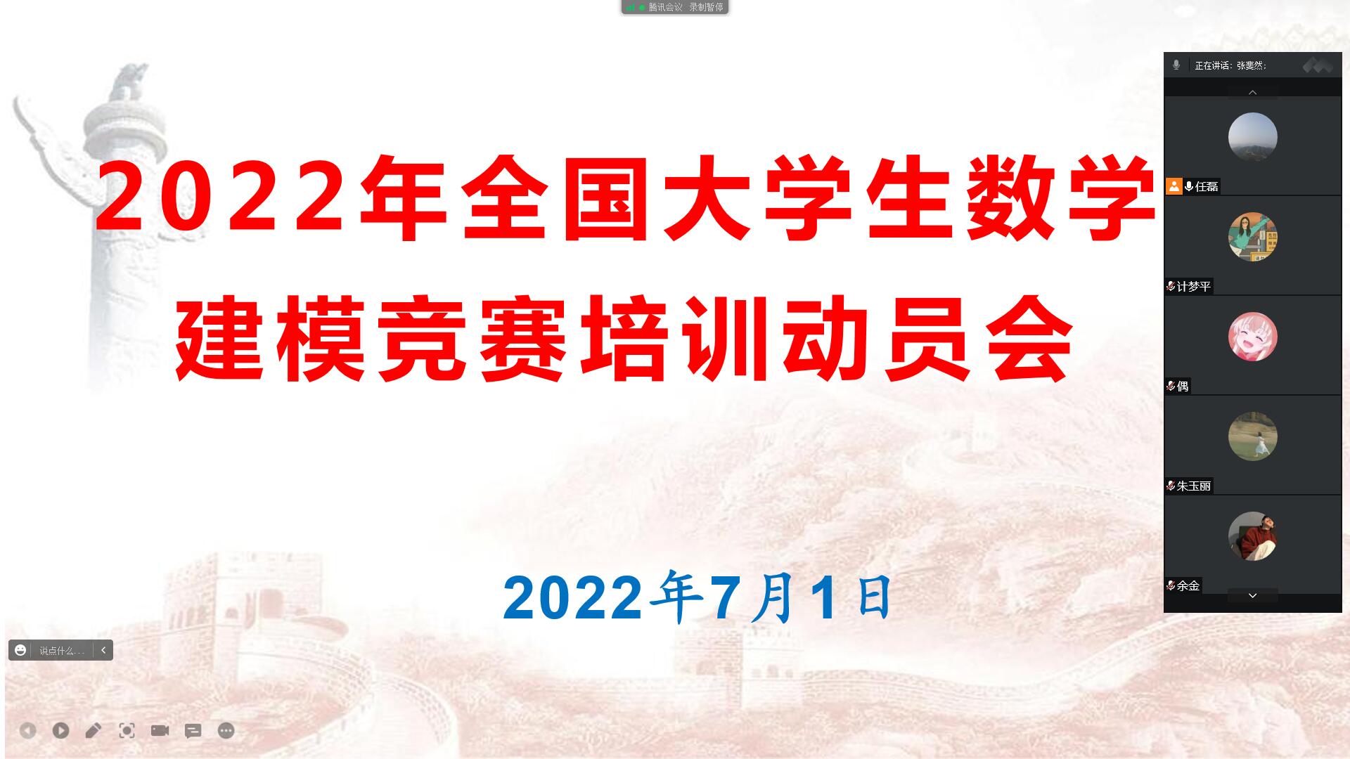 7月1日,2022年全国大学生数学建模竞赛动员大会通过线上腾讯会议的形式顺利举行,beat365英国官网网站院长张斐然、副院长刘磊 、数学建模全体指导老师以及来自beat365英国官网网站、电子电气工程学院、化学化工学院、信息技术学院、经济管理学院、测绘与规划学院、建筑工程学院、国际教育学院等261名参赛队员参会,会议由刘磊主持。