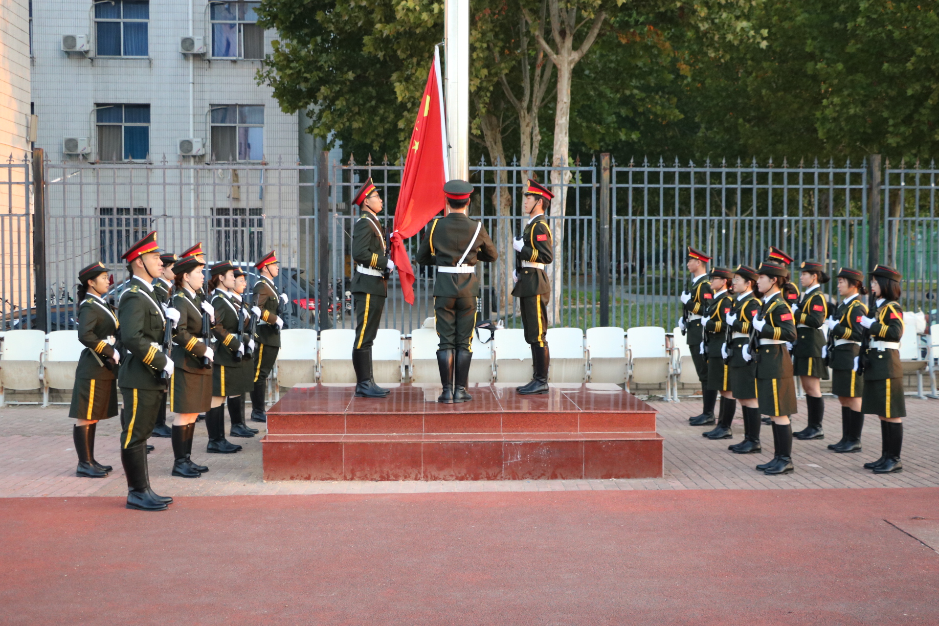 上午6点50分,主题升旗仪式正式开始。在全体师生的注目礼下,国旗护卫队的成员迈着整齐划一、铿锵有力的步伐,护送着五星红旗走到旗杆下。随着激昂的《中华人民共和国国歌》响起,师生们合唱国歌,注视着五星红旗冉冉升起,在熠熠晨光中迎风飘扬。