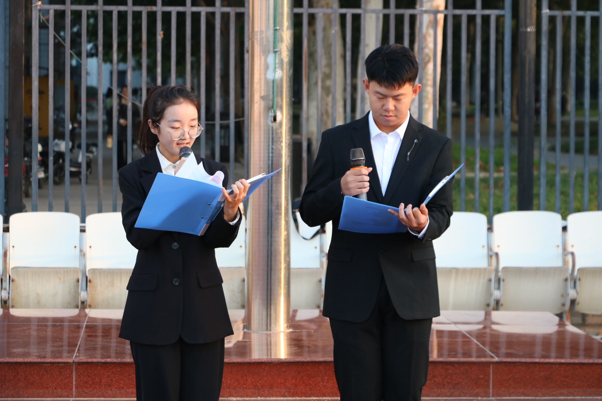 在升旗仪式结束后,学院组织开展了主题党日活动,学院教师党员、入党积极分子代表参与了此次活动。学生代表程致远、吴越进行国旗下的朗诵——《时代精神茂风华,传承精神谱新章》。两位同学精神饱满、激情昂扬,声情并茂地回顾了党的光辉历程和丰功伟绩,赞颂了中国共产党团结带领中国人民取得的历史性成就,鼓励同学们踔厉奋发,以蓬勃青春力量,挥写青春诗行,建设万里河山。