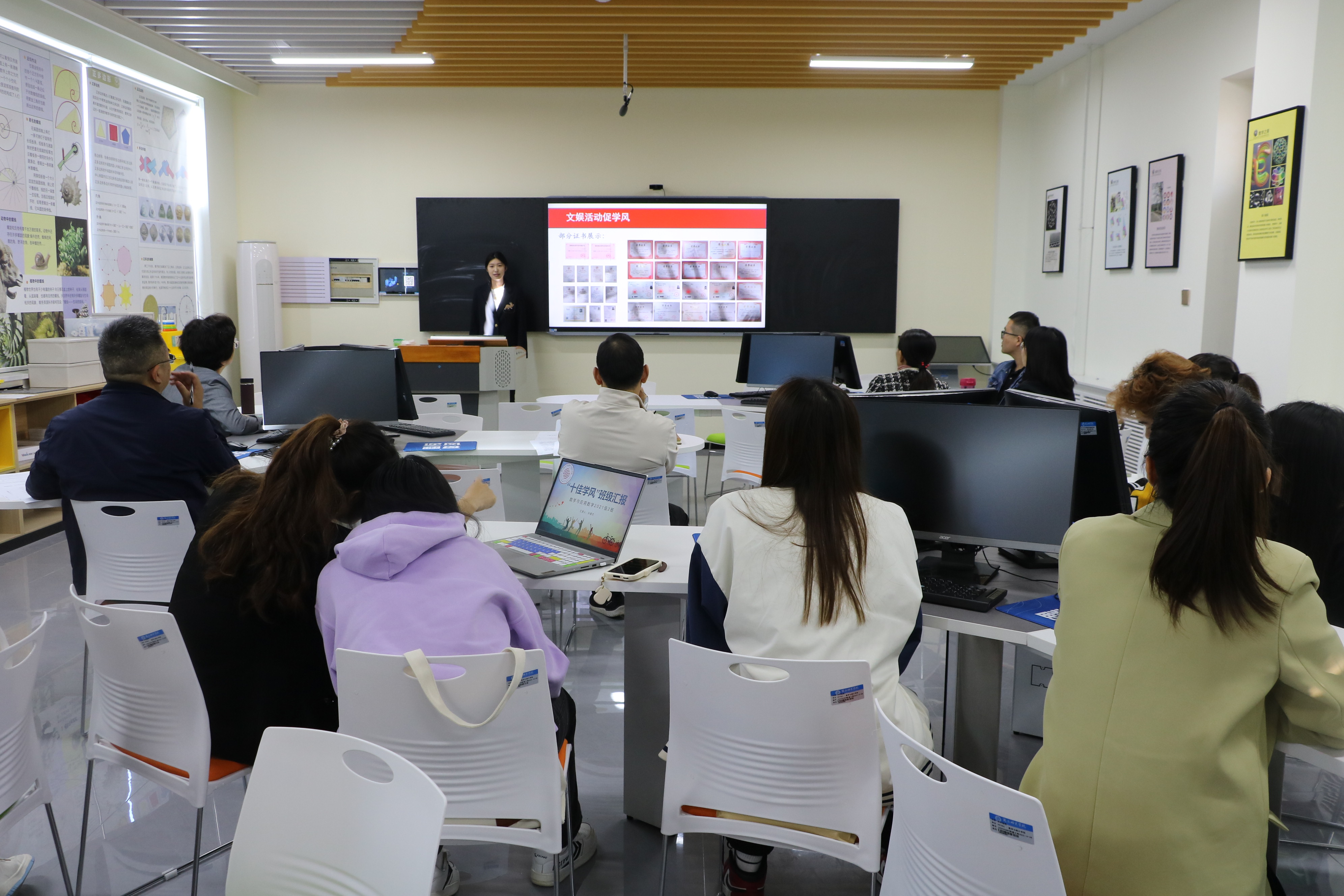 活动伊始,陈书记强调了学风建设的重要地位和作用,指出要把学风建设工作落在实处、取得实效。在介绍了此次汇报的规则和注意事项后,各班汇报人依次上台,通过精心制作的PPT分别从思想教育、考勤纪律、班级荣誉以及考研积极性等主要方面着手,讲述了各自班级学风建设的具体做法,展示了班级学风建设的优秀成果。此外,各班汇报人总结和分享了班级学风建设的宝贵经验,并表示班级将继续保持优良学风习惯,为学院学风建设添砖加瓦。
