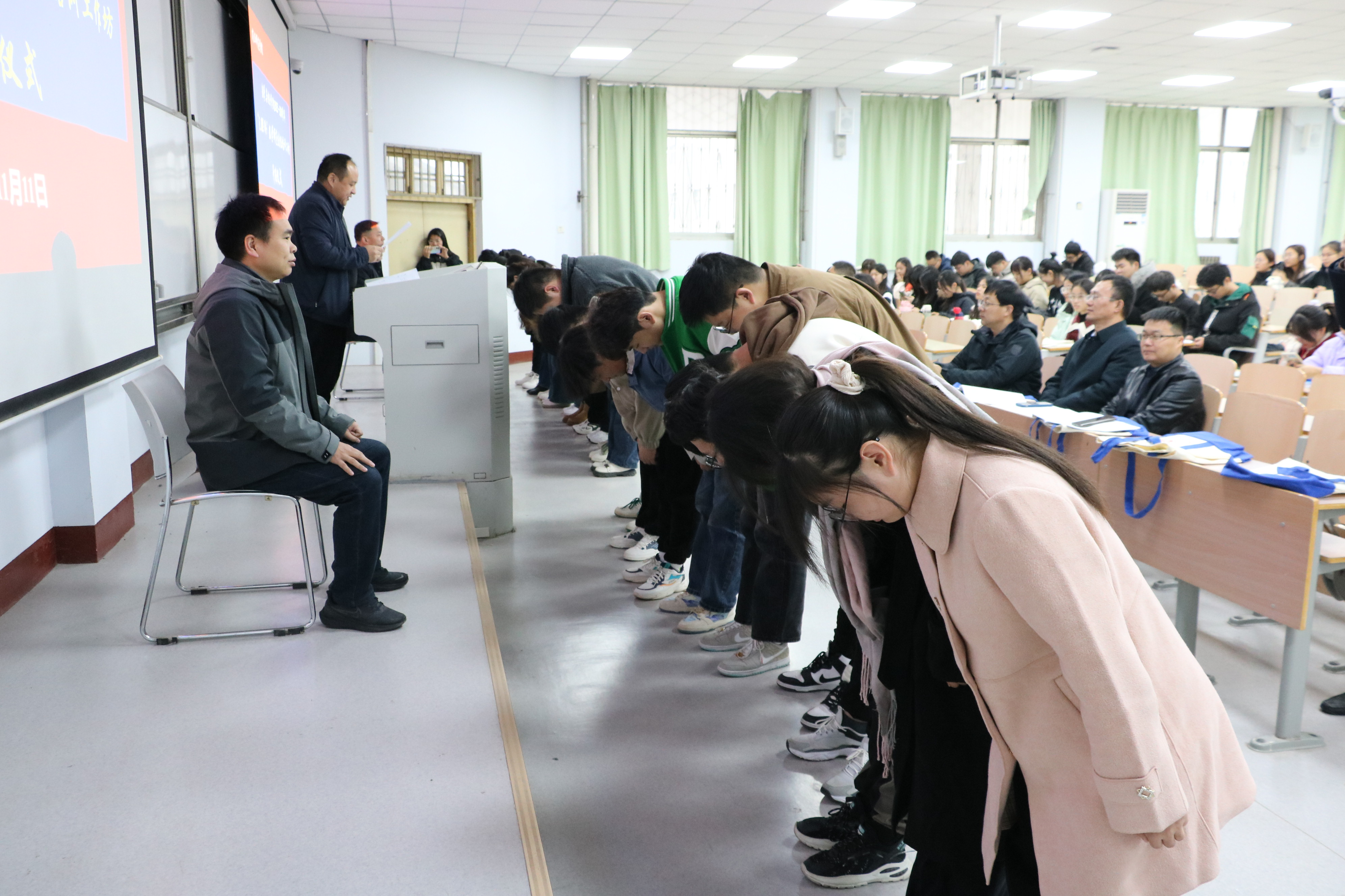 副院长刘磊首先强调了尊师重教是中华民族的传统美德,并宣读了各组师生名单,随后各组学员依次上台向坊主三鞠躬行拜师礼:一鞠躬“师道之要,修身立德”;二鞠躬“传道授业,释疑解惑”;三鞠躬“铭记师恩,天地可鉴”,并进行合影留念。佟俊姬老师宣读2023-2024学年“互联网”+中学数学师范生技能培训工作实施方案,介绍了技能培训时间安排、具体工作等内容,明确了各坊主和学员在培训过程中的任务。