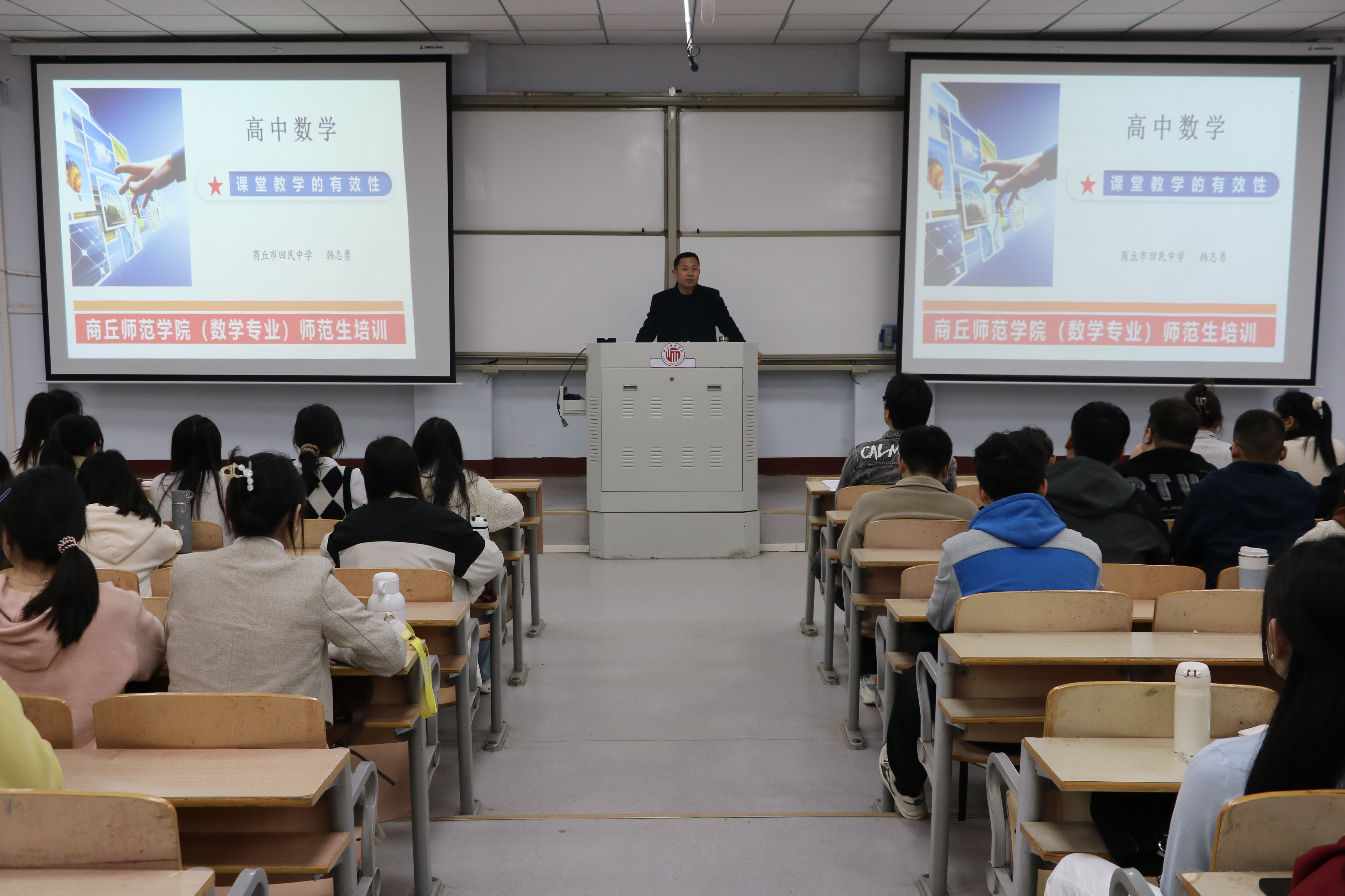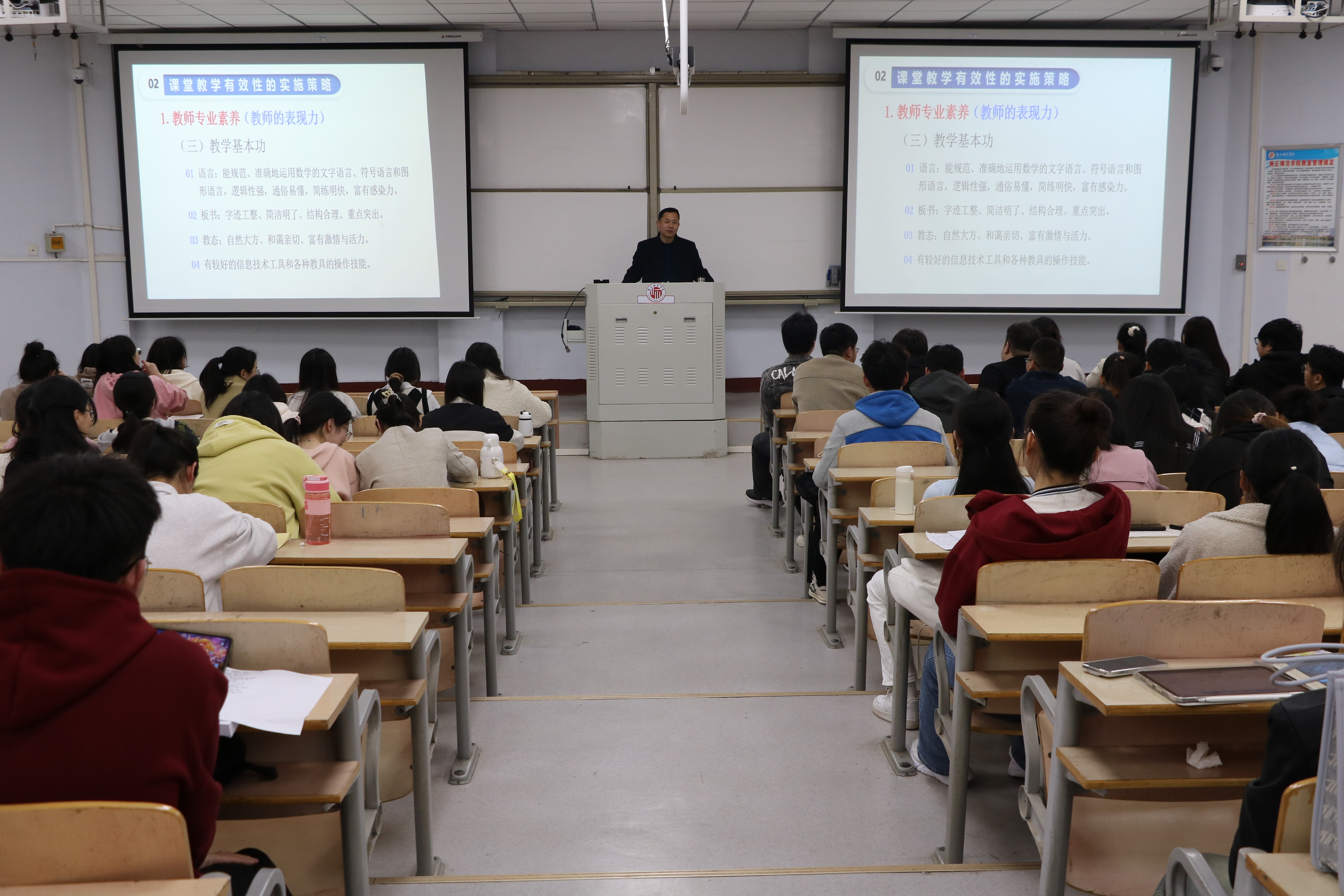 本次培训从“高中数学课堂的有效标准”、“高中数学课堂教学有效性的实施策略”和“提高高中数学课堂有效性的方法”三个方面展开。培训开始,韩志勇向同学们讲述了新时代老师的功能以及工作内容,帮助同学们深入理解教师的具体含义。接着,向同学们介绍了新课标理念、高中数学课程目标的发展进程以及判定课堂教学是否有效的两个标准,并通过对比初中数学与高中数学,指出“四基”、“四能”和“数学核心素养”在提高课堂有效性方面的重要性。随后,针对课堂教学有效性的实施策略,从教师专业素养和课堂教学与实施两个层面进行详细解释并给出解决办法。最后,韩志勇从五个方面具体阐述了提高高中课堂有效性的方法,以自身经历指导、教育并鼓励同学们努力提高自身技能水平。