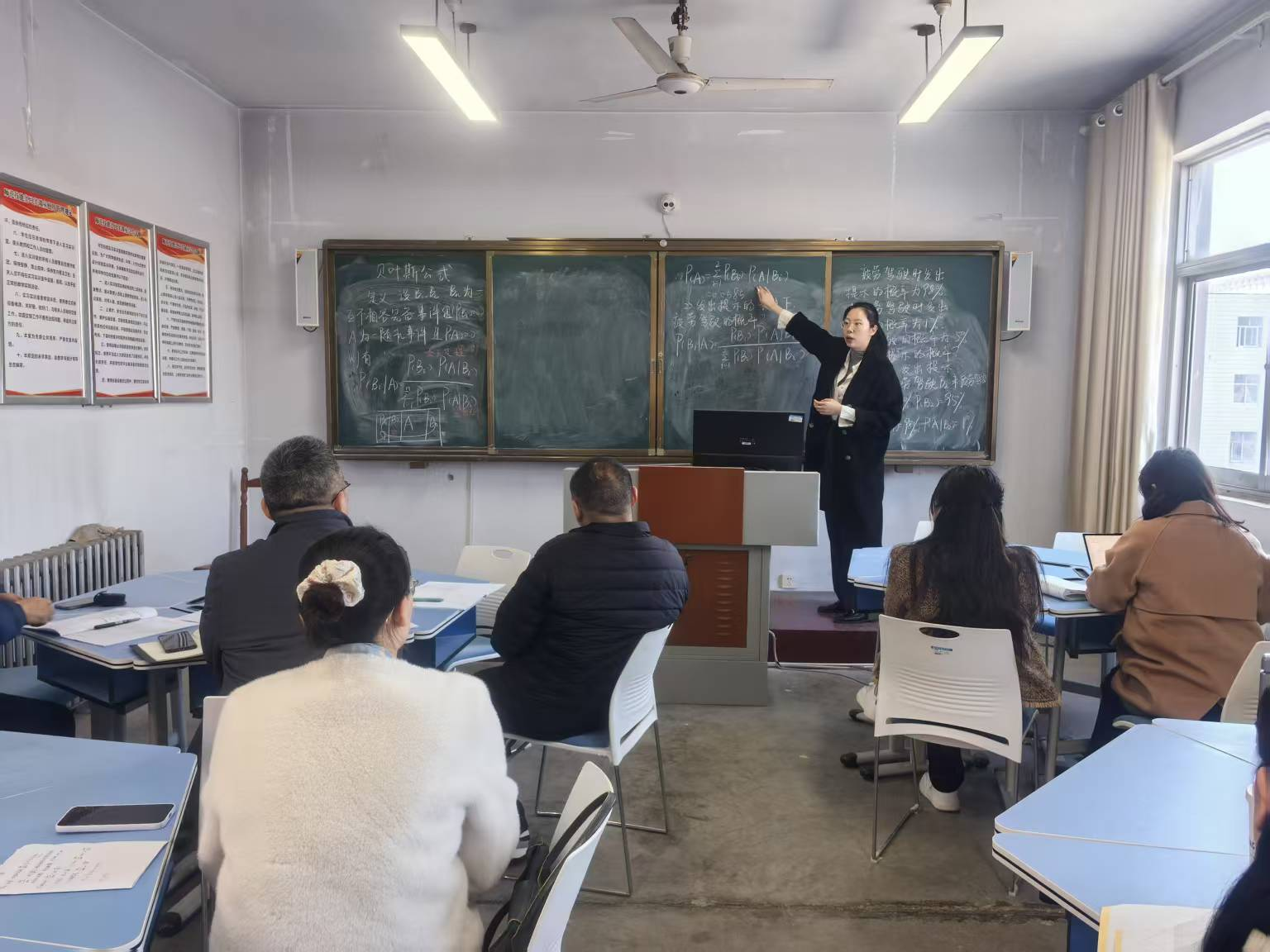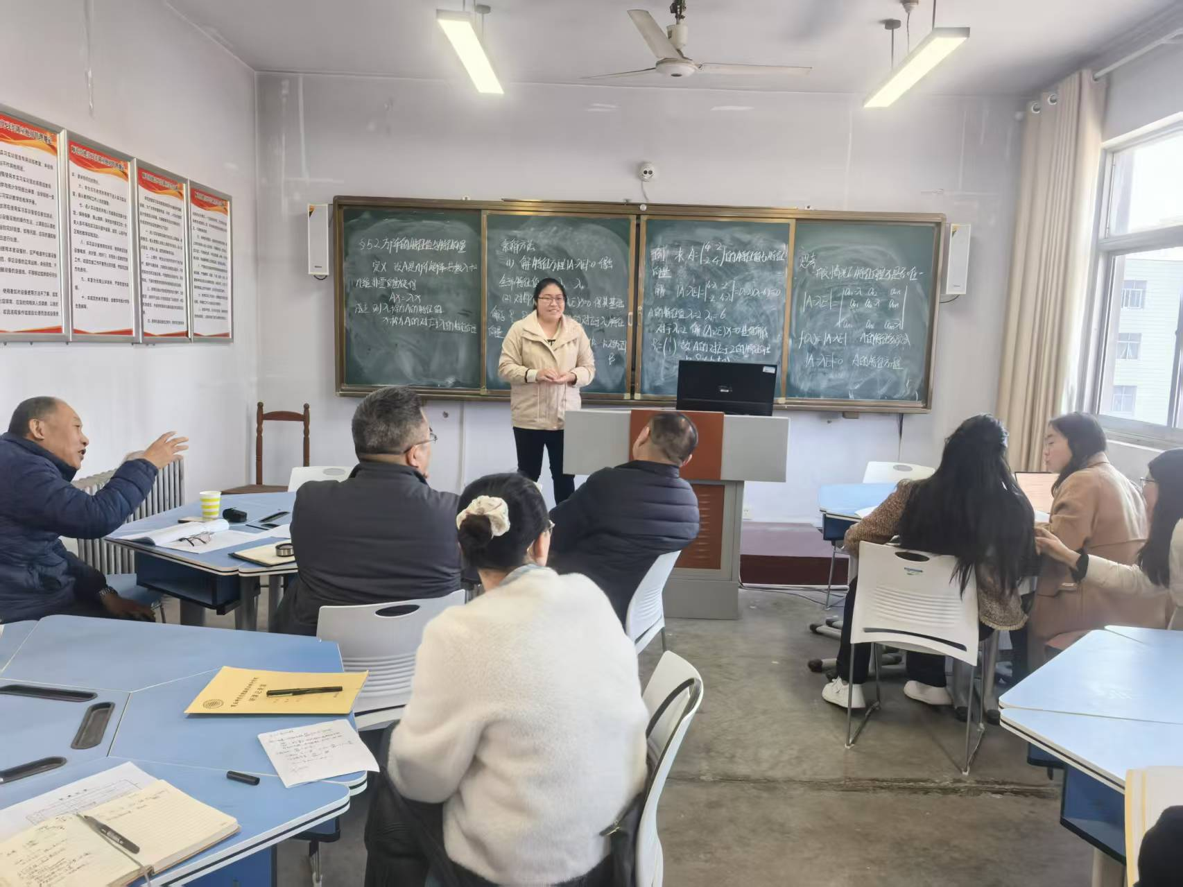 根据安排,每位新教师需在20分钟内完成一节完整教学片段的展示,内容涵盖高等数学、概率论与数理统计、线性代数等核心课程。展示环节结束后,专家团队从教姿教态、板书设计、教学方法、语言表达等维度精准指导,指出新教师需加强课堂互动与逻辑衔接,避免“填鸭式”教学,并现场示范“板书三区划分法”(公式推导、例题解析、要点总结分区呈现),建议通过生活化比喻降低抽象概念理解难度。