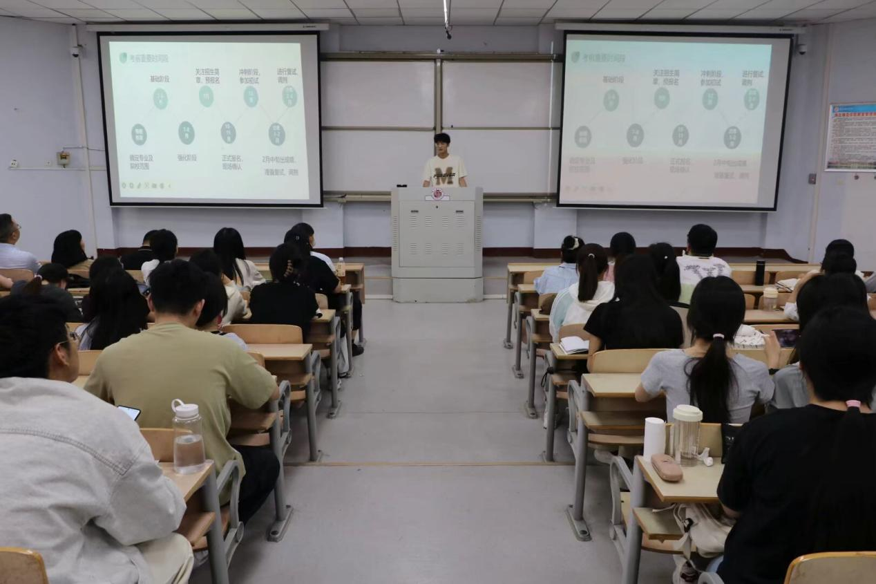 会议伊始,张斐然从考研对个人长期发展、2025年考研情况、就业形势、考研优势等几个方面强调了考研的重要性和必要性,从锚定目标、就业前景等方面给出了极具实用性的建议,为同学们未来发展给予了针对性的指导。随后,2025届考研成功上岸的曾玉欣、段苏珂、赵彤、孙圆圆、陈浩、郑权权、马冬颖七位学子分别分享了考研经验。他们从备考计划、学习方法、心态调整等多个方面进行了细致地讲解,内容涵盖了如何选择适合自己的院校、如何制定科学的复习计划以及在备考过程中如何应对各种困难等。这些经验分享具有很强的针对性,让在场的同学们受益匪浅。