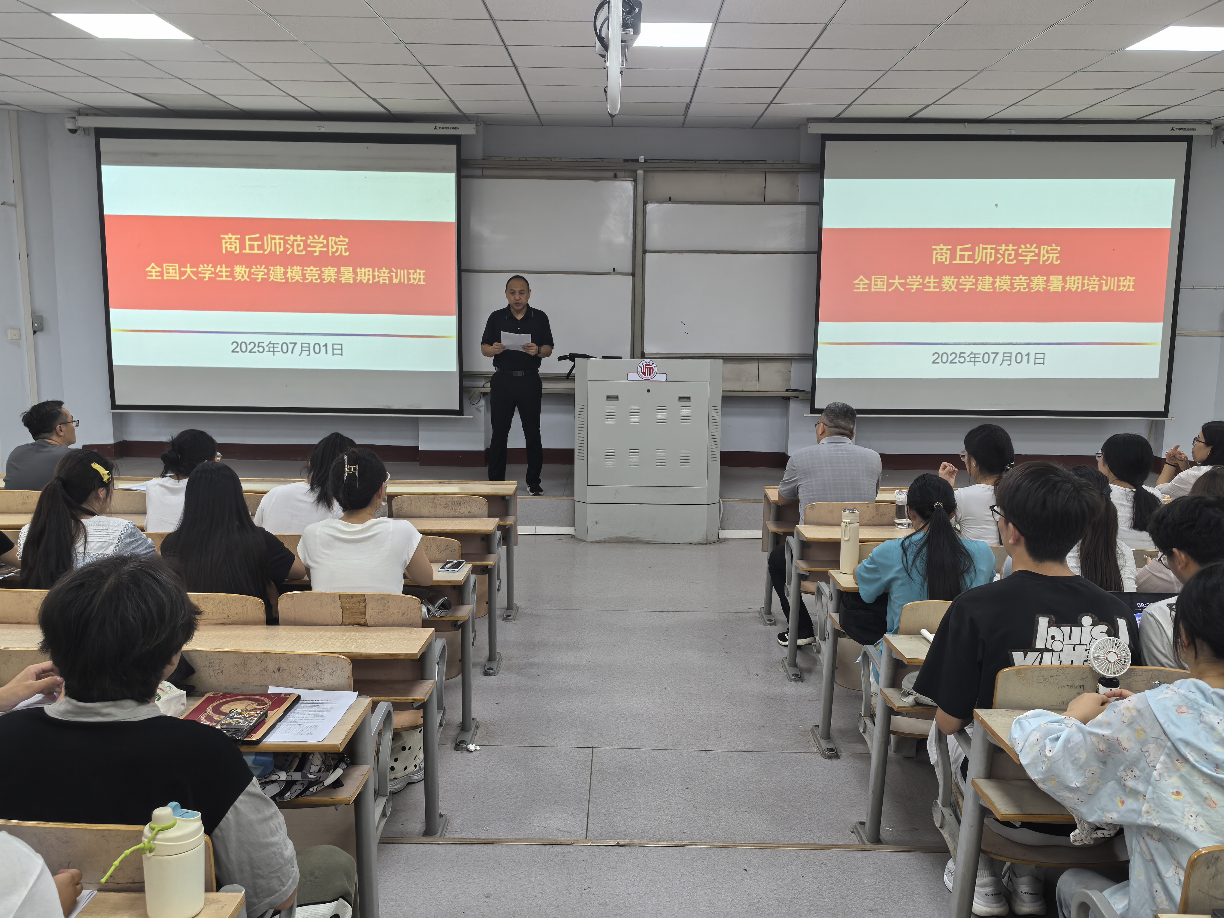 为提升学生运用数学方法与计算机技术解决实际问题的能力,全力备战2025年全国大学生数学建模竞赛,在学校的统筹领导及教务处、各学院的协同支持下,beat365英国官网网站经前期选拔与充分筹备,组织指导教师有序开展数学建模竞赛暑期培训。7月1日上午8时,培训开班仪式在睢阳校区一号教学楼307教室举行。学院副院长刘磊、任磊,数学建模指导组全体教师及150余名参训学生共同参加了此次活动。