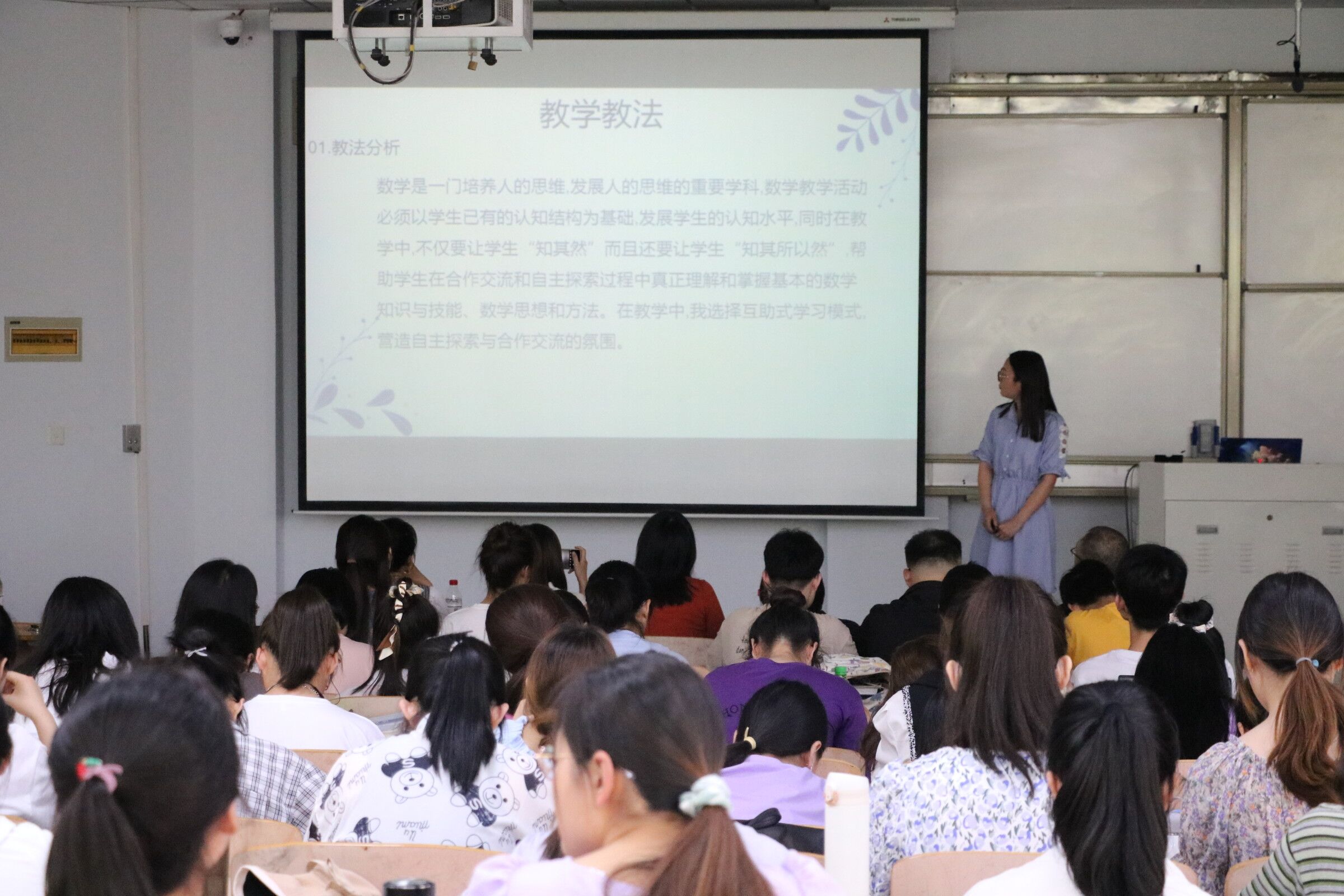 此次交流会共有21名学生代表参与说课成果展示比赛。比赛中,参赛选手能准确把握说课精髓,结合精心设计的PPT对说课的六个基本环节:说教材、说学情、说教学目标和重难点、说教法和学法、说教学课程、说教学预期效果进行讲解分析,展现了独特的教学风采和优秀的学科素养。本次说课成果展示交流会的开展也意味着“互联网+”初中数学工作坊说课活动接近了尾声,指导老师表示欢迎大家日后向工作坊中的老师们请教交流学习工作中遇到的有关数学教学的问题。